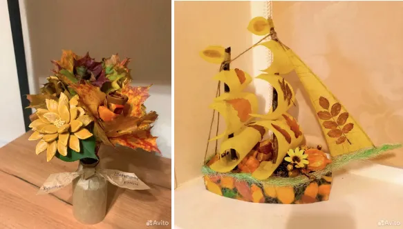 Поделки в первую очередь ассоциируются с осенью. Дети изучают, как со сменой времен года меняется и природа — желтеют кроны деревьев, появляются каштаны, желуди, шишки. Обычно такие поделки изобилуют желтыми осенними листьями — веский повод наградить подобную работу за яркое исполнение. Петербуржцы создают настоящие шедевры из подручных материалов, например корабли, а жители Челябинска собирают букеты с цветами, сделанными из кленовых листьев и тыквенных семечек.