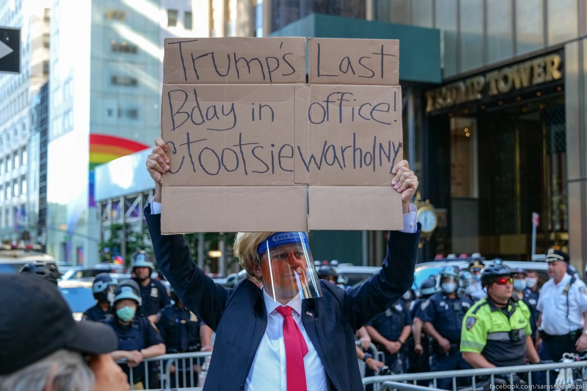 В итоге, я оказался словно между молотом и наковальней. С одной стороны надвигалось бурлящее цунами протеста, а с другой стояли заградительные рифы полиции. Оказалось, что у Трампа был день рождения и его пришли поздравить. Хорошо, что все прошло мирно и протестующие ограничились лишь плакатами, криками и демонстрацией своих молодых средних пальцев. Стоя у памятника Колумбу на Коламбус-сёркл имел беседу с итальянцем из Бруклина. Пожилой дядечка в футболке с надписью Italia возмущался происходящим и переживал, что наши с ним фотки могут стать историческими если Колумба не уберегут. К счастью, пока памятник охраняет столько полицейских, что можно не волноваться.