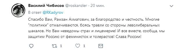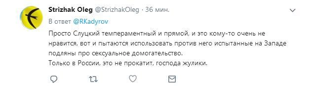 «Леонида Слуцкого я называю братом. Он в трудные дни был с нашим народом. Сексуальные домогательства — полный бред. Возможно, сделал комплимент красивой девушке. Это долг настоящих мужчин. Как к нему девушки пристают, я видел. Как он к кому-то — ни разу. Держись, Леонид, мы рядом», — написал Кадыров в Twitter.