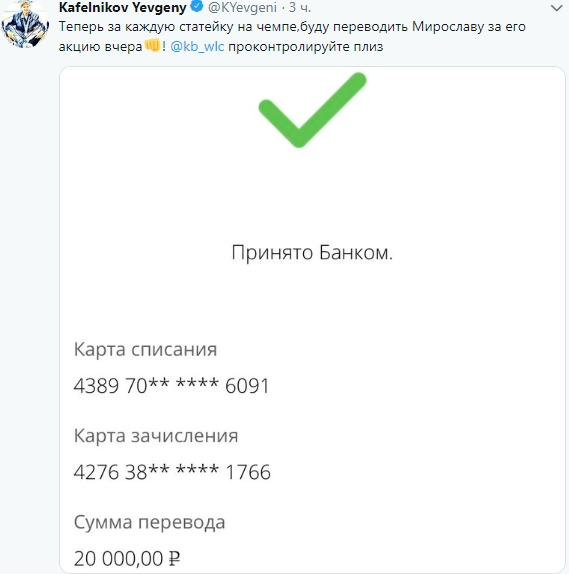 Сначала Кафельников отправил 10 тысяч рублей, а затем еще 20, опубликовав в Twitter подтверждение банка.