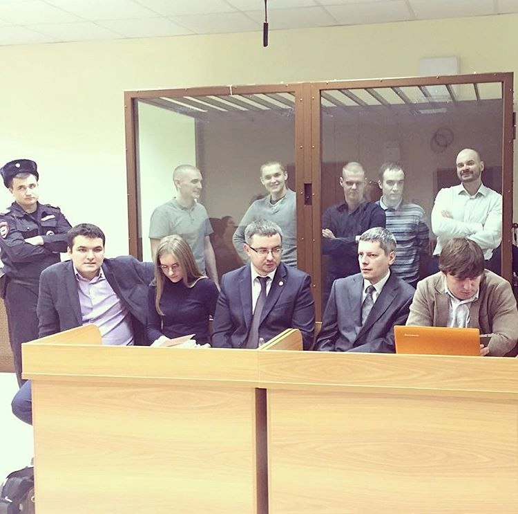 На скамье подсудимых десять человек, включая известного на всю Россию ультраправого общественного деятеля Максима «Тесака» Марцинкевича.