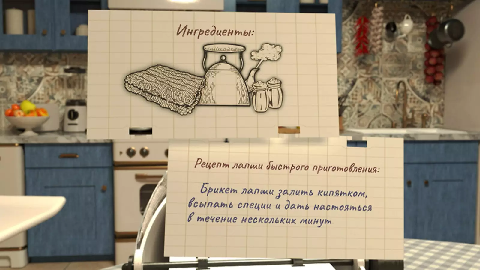 Рецепт лапши быстрого приготовления: брикет лапши залить кипятком, всыпать специи и дать настояться в течение нескольких минут.