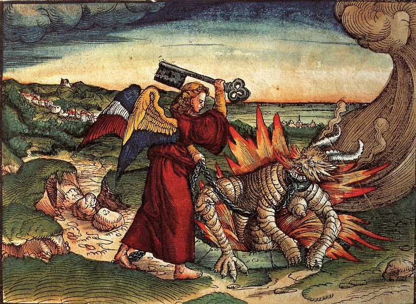 Ангел (предположительно Михаил) борется с Сатаной и заковывает его в цепи.
