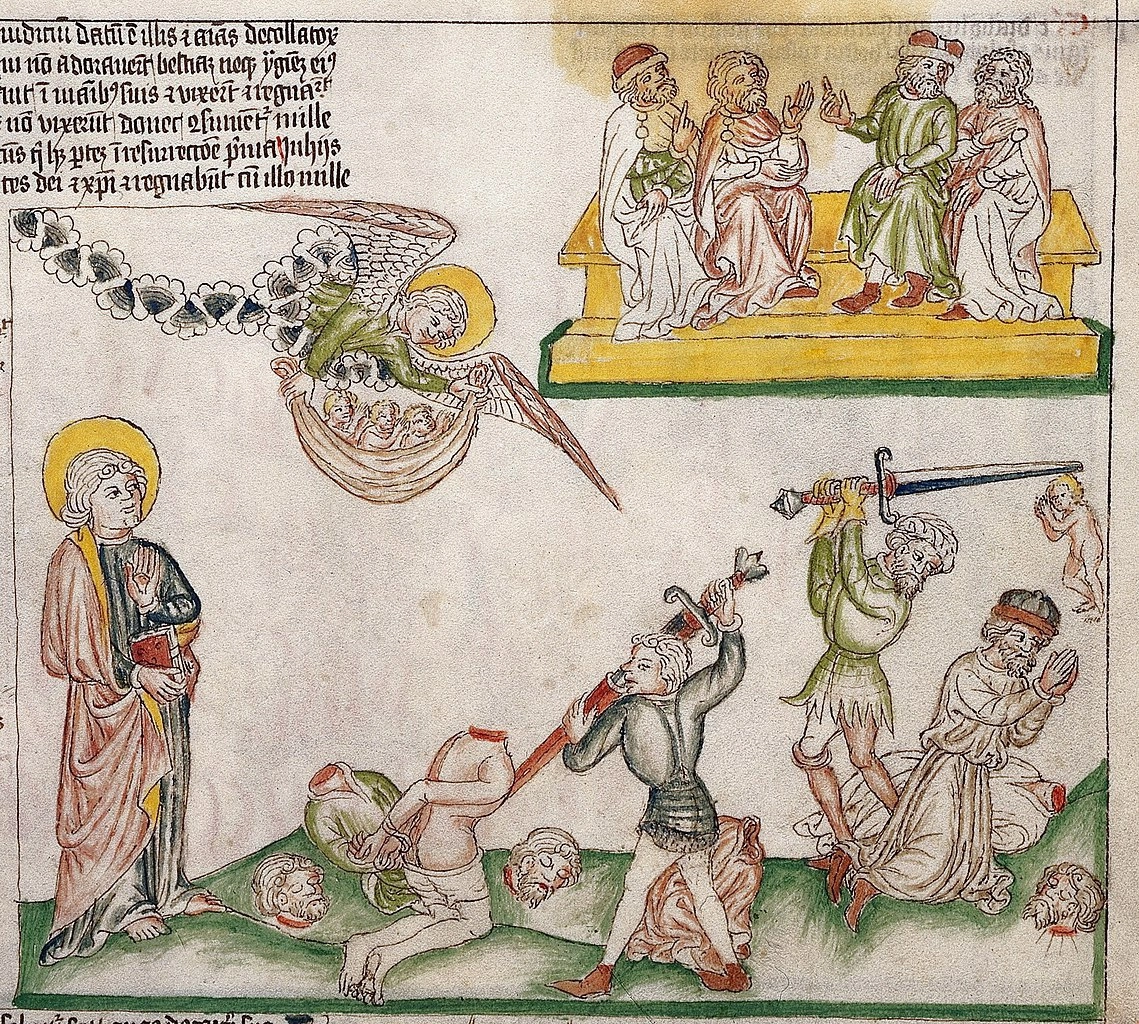 История этих судий: в нижнем регистре им рубят головы за отказ поклониться Зверю из моря. Слева, как обычно, стоит свидетель-Иоанн. В центральном регистре летит Ангел, у него в руках полотнище с душами этих верующих мучеников. И, наконец, наверху они сидят уже в образе судий.