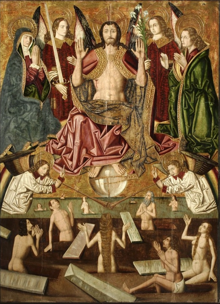 В центре возлежит Христос, по бокам фигуры взрослых — это воскресшие судьи, бывшие мученики за Христову веру. Голые младенцы -- изображения воскресающих душ. Под ними -- гробы с мертвыми телами. Эти иллюстрации подразумевают, что данное первое воскресение не будет телесным. «Остальные мертвые», которых не воскресили, это и язычники, и веровшие в Христа, но не ставшие мучениками за веру, а умершие своей смертью.