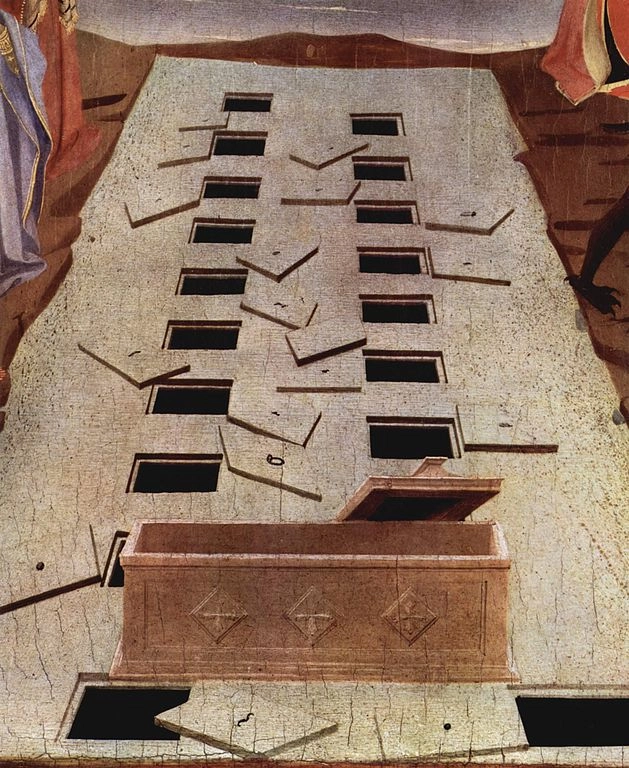 И вот начинается Страшный суд, к которому мы, мой выносливый читатель, шли с января, уже 19 глав. В нижнем регистре, откинув крышки из гробов, из земли выбираются мертвецы. В середине трубят ангелы: хотя по тексту в этой главе их нет, но образ трубящих ангелов был такой мощный ранее, что он появляется фактически во всех католических работах на эту тему.
