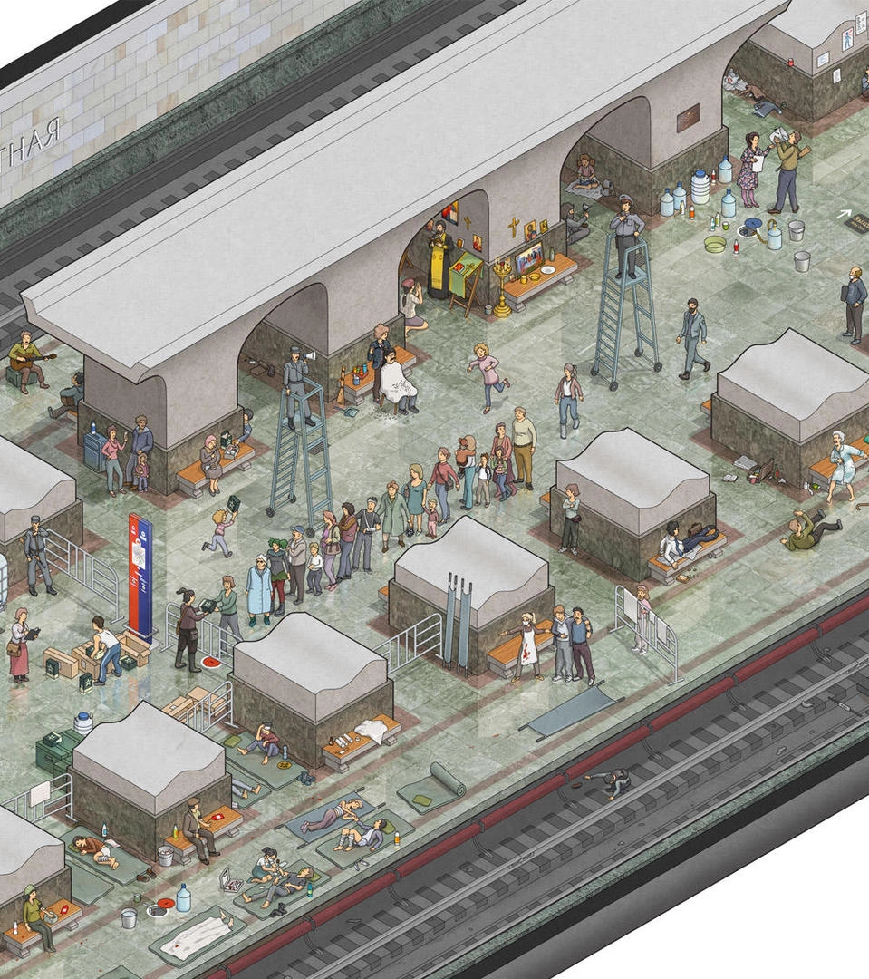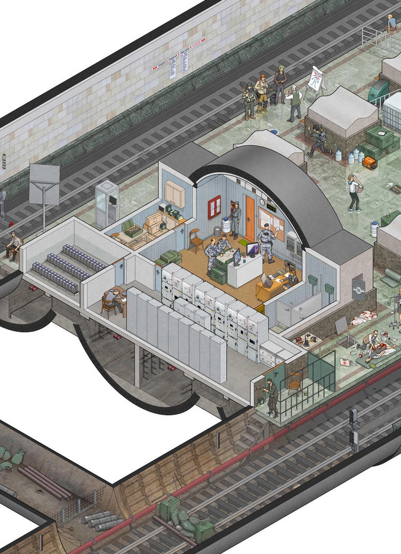 Иллюстратор Максим Дегтярёв нарисовал краткое пособие о том, как выжить в московском метрополитене в случае зомби-апокалипсиса. Среди рисунков - эпизоды атаки зомби, план побега от ходячих мертвецов и бытовые сцены на станциях метро. Картинки несут не только художественный смысл, но и обладают некоторыми подсказками: где лучше организовать штаб, как использовать коллектор и вентиляцию.