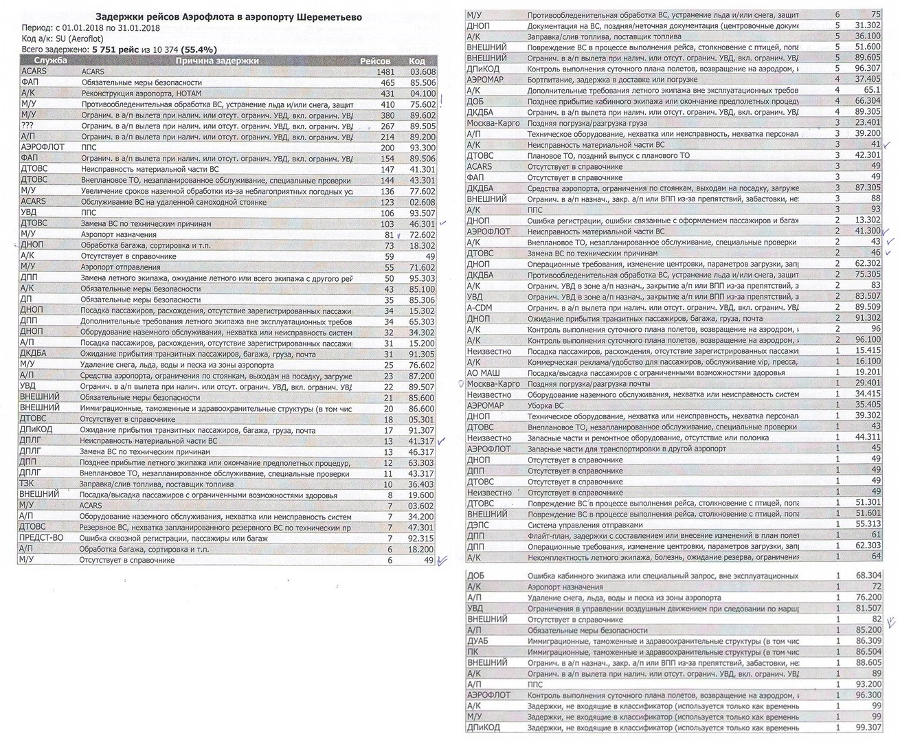Итак, документ гласит, что за период с 1 по 31 января 2018 года всего был задержан 5751 рейс, что составляет 55,4% от всех рейсов «Аэрофлота». То есть больше половины.