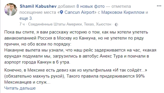 «Накануне вылета мы узнали, что наш рейс задерживается на час. „Какая ерунда“, подумали мы, загрузились в автобус „Анекс Тура“ и помчали в аэропорт города Канкун в 6 утра. — написал в Facebook один из пассажиров Шамиль Кабушев. — Засели в отличное заведение (наверное, лучшее в Мексике) Bubba gump, решили позавтракать, а тем временем рейс перенесли еще на часик, просто так, зачем нам говорить причину? Ура, началась посадка, и вот мы в самолете, 15, 30, 45, 60 минут сидим, шутим, хихикаем, а капитан говорит: „Скоро полетим“».