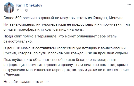 «Нам никто не помогает, кроме сотрудников мексиканского аэропорта, которым даже не отвечает офис „России“», — объяснил он.