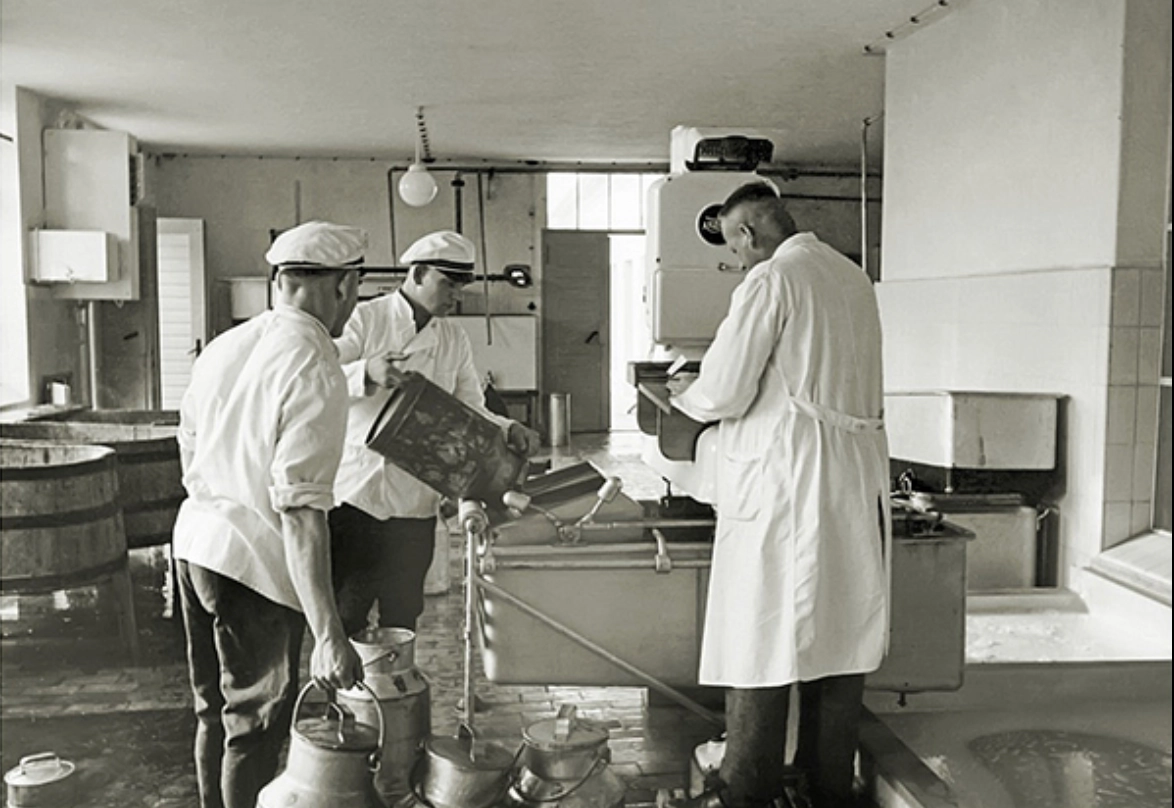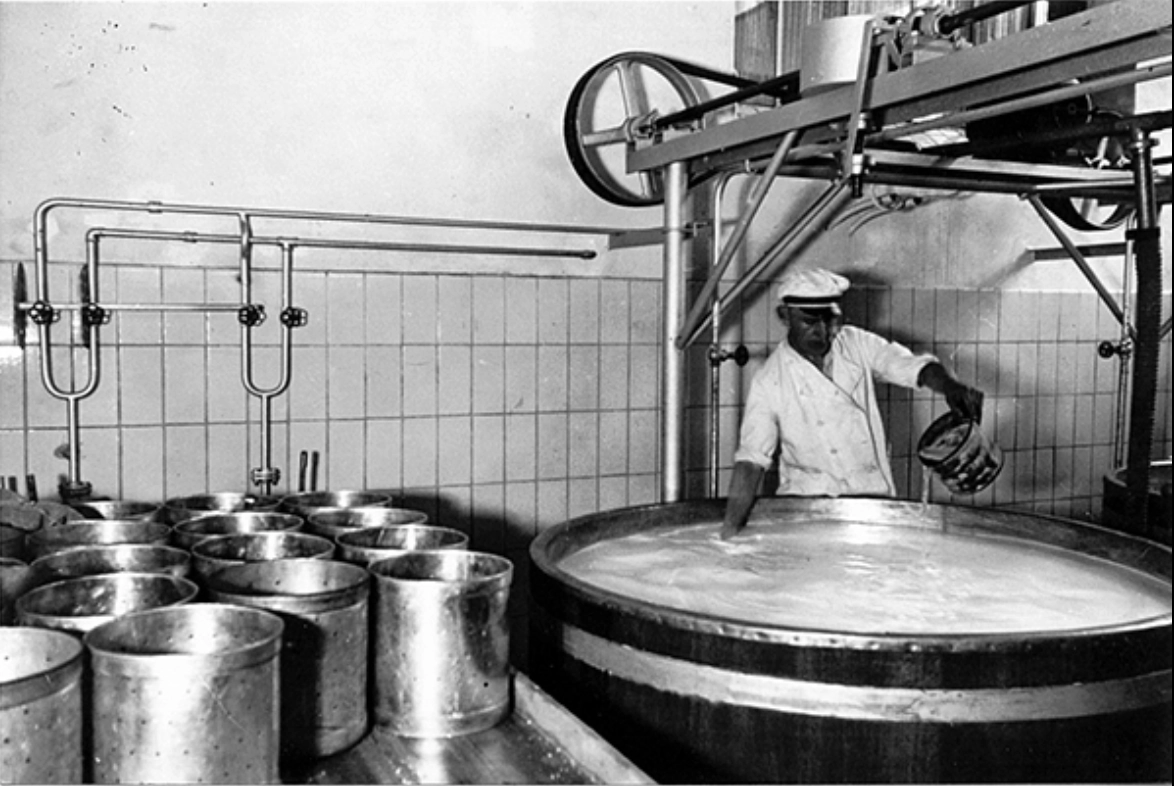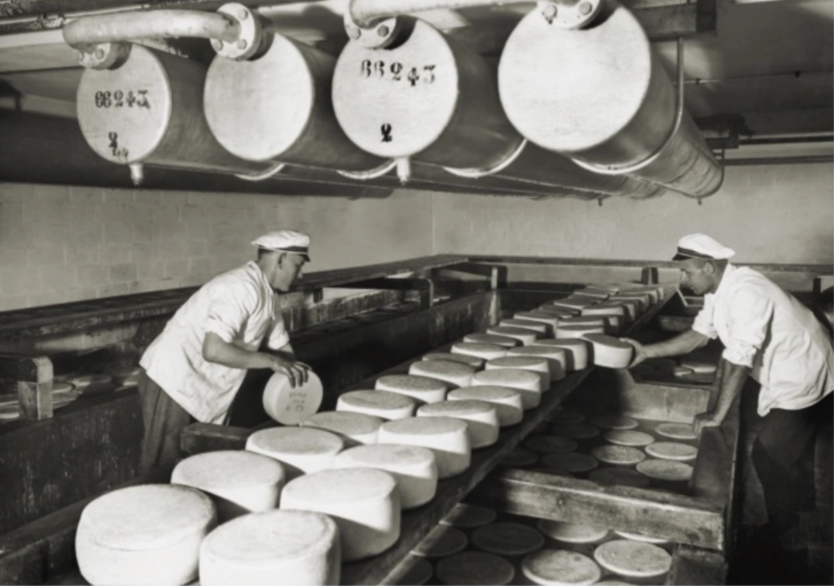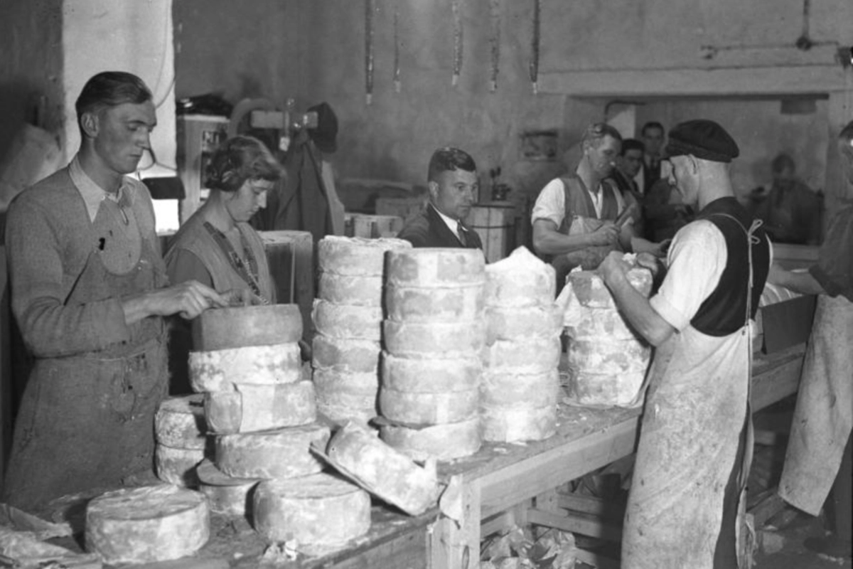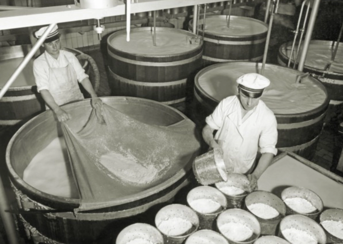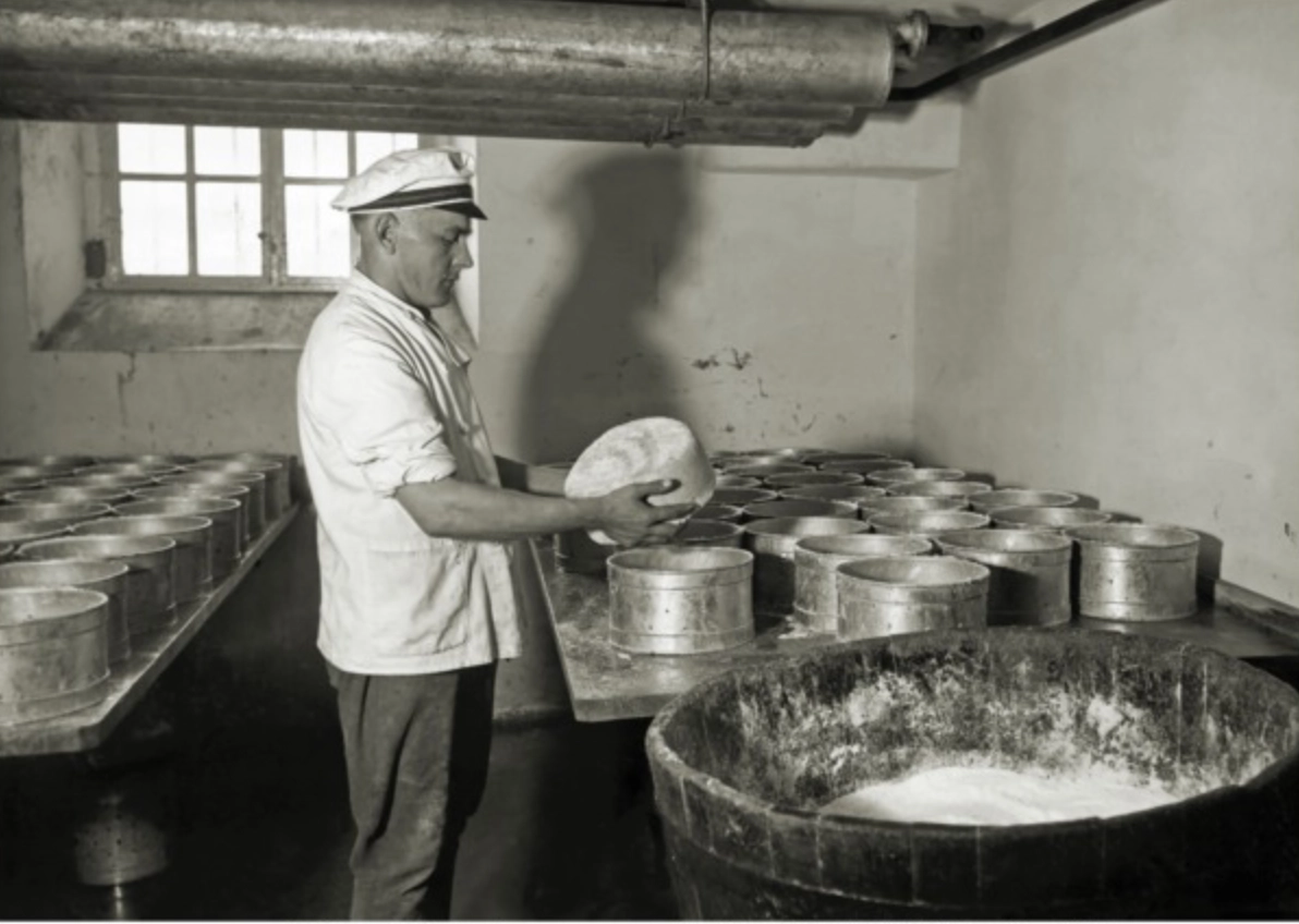 А мы можем посмотреть на то, как выглядело производство знаменитого сыра в те времена на его истерической родине, в старых архивах сохранились фотографии этого процесса.
