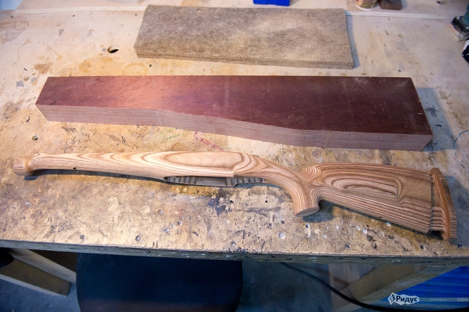 Параллельно изготавливаются детали затворной группы и ударно-спускового механизма — всевозможных процессов тут очень много, подробно все не описать. В древесном цехе под готовый ствол на автоматическом станке из бруска ламината, который заказывают в США, изготавливают ложе. Затем мастера в ручную дорабатывают конструкцию. По индивидуальному заказу, ложе может быть выполнено из орешника и добавлена гравировка.