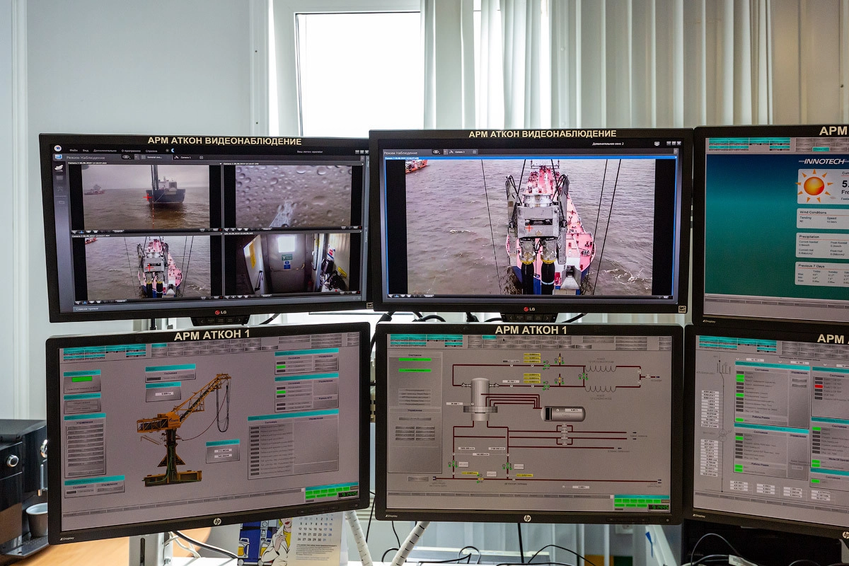 Терминал «Ворота Арктики» автоматизирован и на нем нет сотрудников. Все управление дистанционное. По телекамерам можно видеть, как идет процесс шланговки — присоединения муфты с шлангами от терминала к танкеру. Но о терминале я напишу отдельный материал.