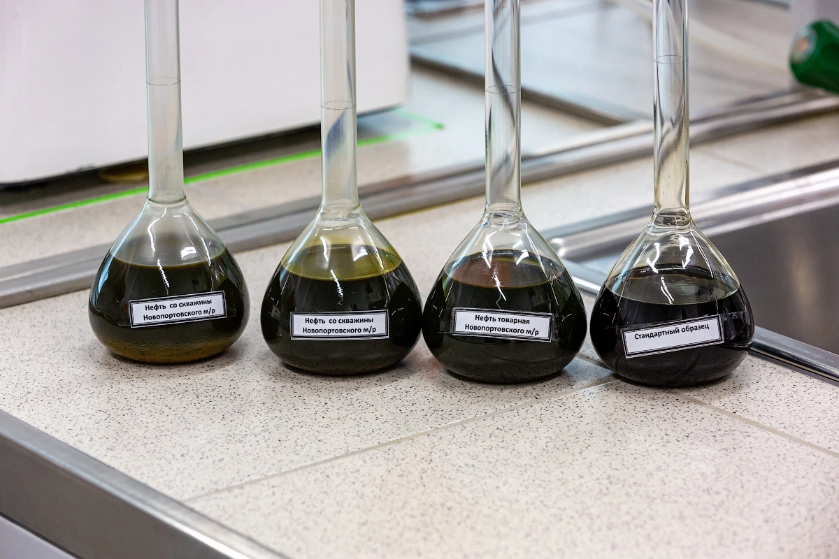 Две колбы слева — нефть из скважин. Потом нефть, которая отправляется заказчику. Справа так называемый сорт нефти Urals — смесь разных сортов нефти с разных месторождений. Так как нефть с Новопортовского месторождения уникальная, то она была выделена в отдельный сорт, который ни с какой другой не смешивают. Кстати, его цена примерно раза в два дороже, чем обычная нефть.