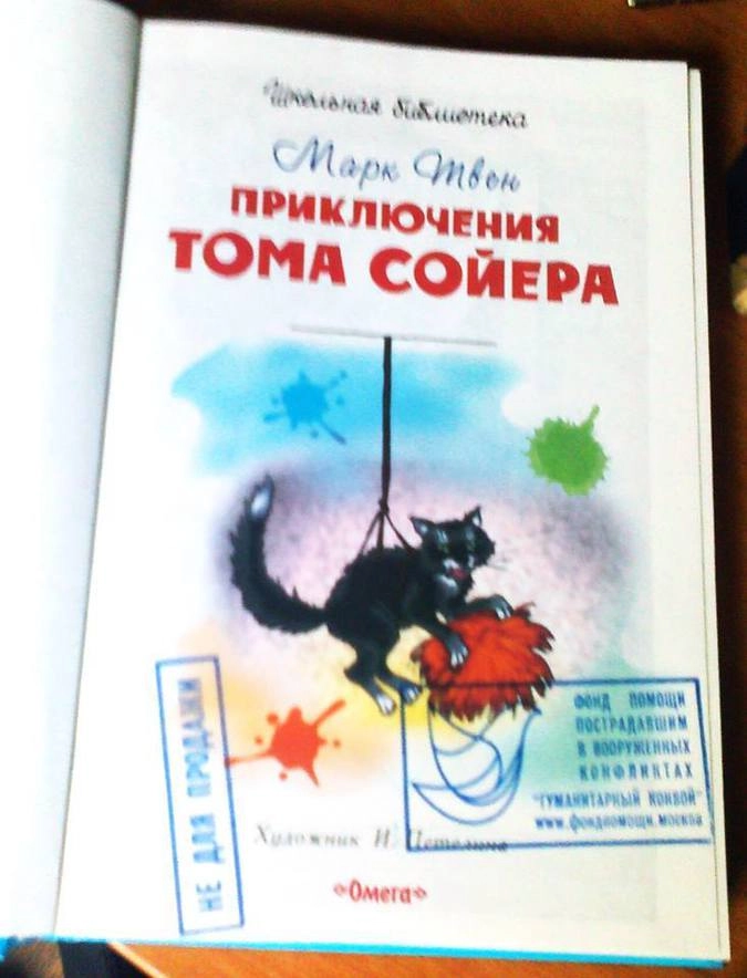 Форзац одной из книг с печатями «не для продажи» и «фонд помощи пострадавшим в вооружённых конфликтах «Гуманитарный конвой»
