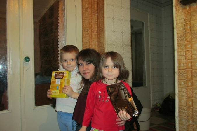 Затем мы отправились ещё по одному адресу – теперь уже в район Горняцкий. Так сложилось, что утром позвонила моя крёстная из Перевальска и рассказала мне о многодетной семье из Чернухино, которая осталась без дома и сейчас живёт в квартире у друзей. В молодой семье трое деток: пятилетний Денис, четырёхлетняя Анюта и девятимесячная Ксюша. Мы сформировали два пакета с продуктами, детским питанием и средствами гигиены, узнали адрес и отвезли всё туда. Дверь нам открыла молодая мама: в коридор тут же выбежали Денис и Анюта – солнечные открытые детки. Признаюсь, было не просто держаться, находясь в такой ситуации в первый раз: озорным малышам невольно хотелось улыбаться, в то время как отчаяние в глазах их мамы вызывало совершенно другие эмоции…