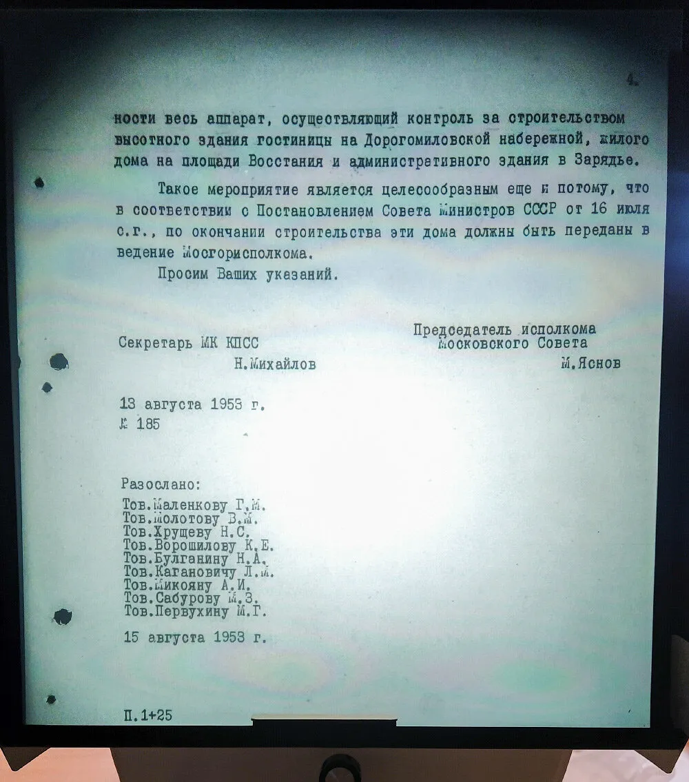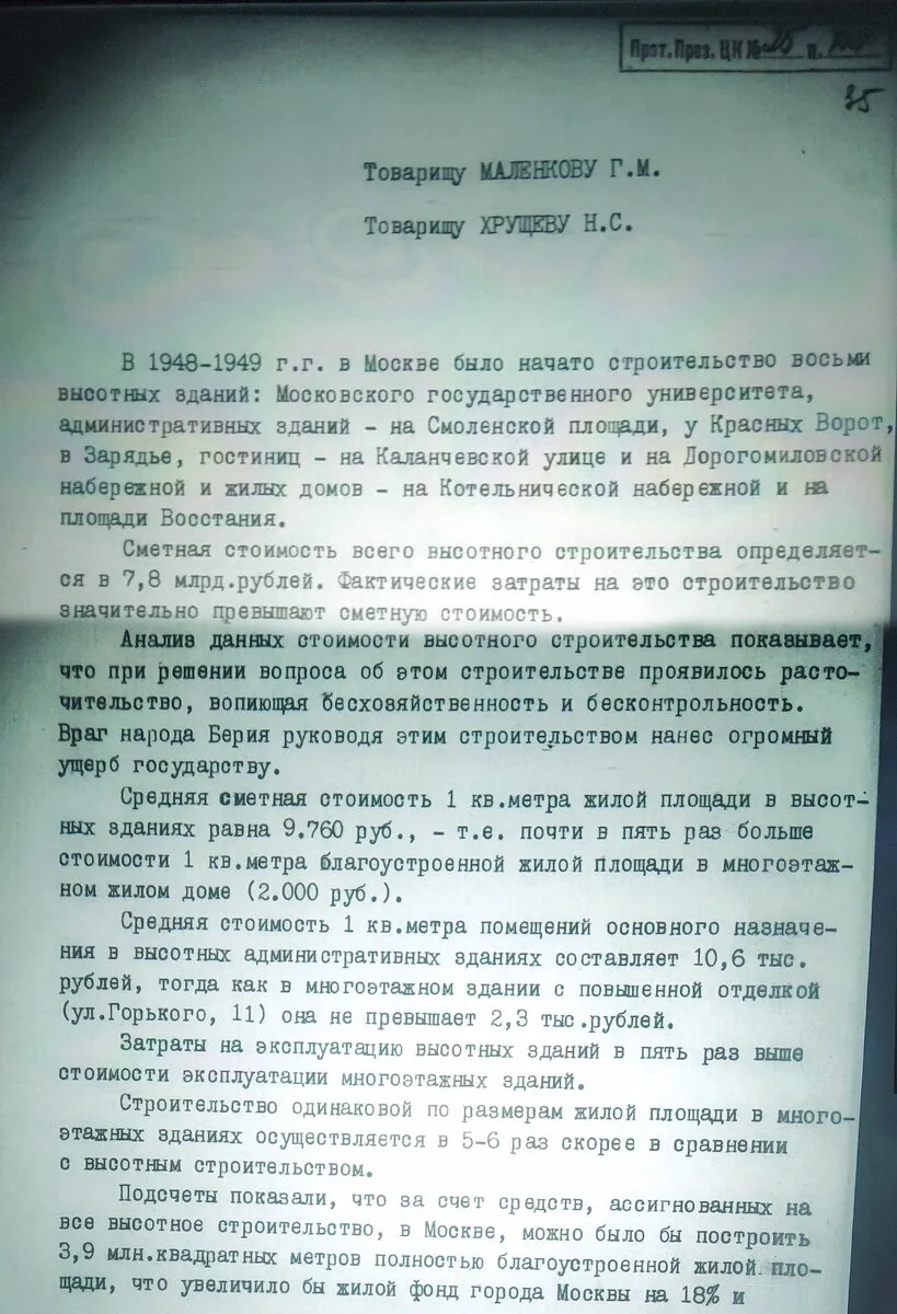 Письмо датировано 1 августа, то есть уже после ареста Лаврентия Павловича. Некоторые историки даже утверждают, что к этому моменту Берия уже был мертв, так как был застрелен при аресте. Но в любом случае, в августе писать про «врага народа» уже можно было. Только я вот не нашел нигде упоминаний о том, что строительством высоток руководил именно товарищ Берия.