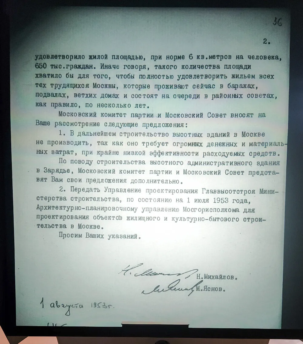 Так, мой коллега (известный под никнеймом to_the_future), ища нужную ему информацию в Российском государственном архиве новейшей истории, наткнулся на материалы о том, как в 1953 году хотели запретить высотное строительство в Москве и громили Сталинские высотки от души. А между тем до знаменитого постановления № 1871 ЦК КПСС и Совета Министров СССР от 4 ноября 1955 года «Об устранении излишеств в проектировании и строительстве» еще как минимум 2 года.