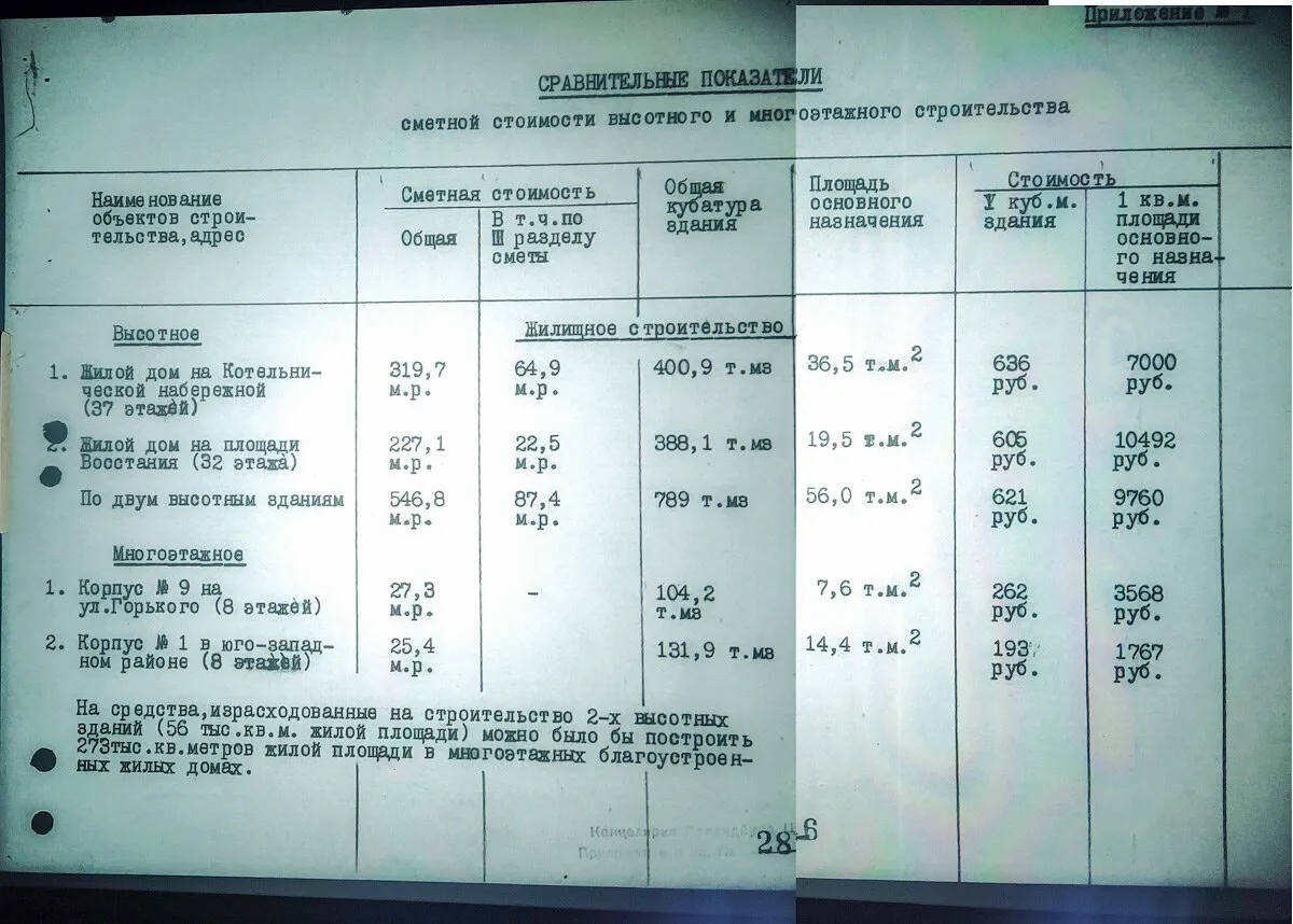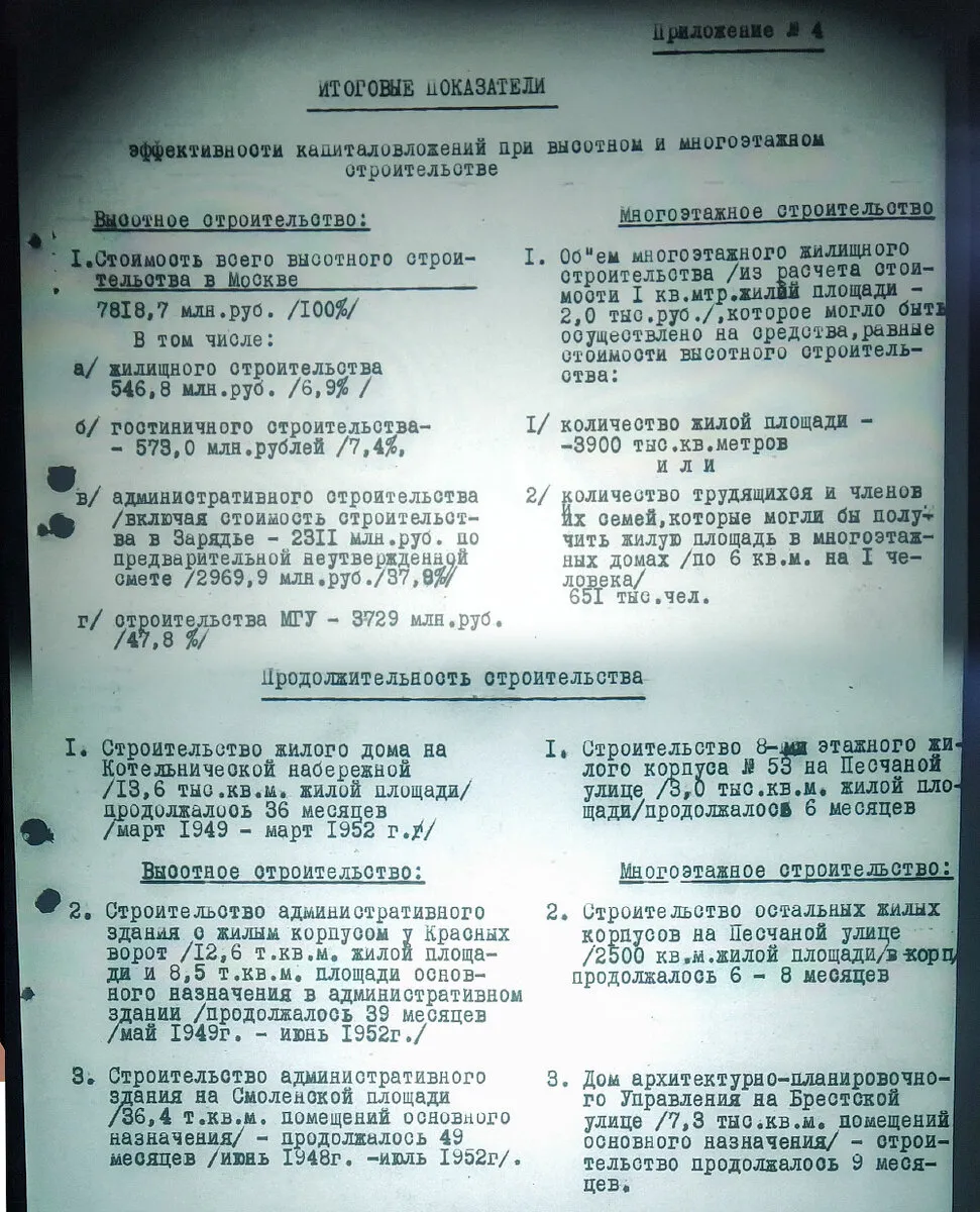 Подсчёты показали, что за счёт средств, ассигнованных на все высотное строительство, в Москве, можно было бы построить 3,9 млн. квадратных метров полностью благоустроенной жилой; площади, что увеличило бы жилой фонд города Москвы на 18% и удовлетворило жилой площадью, при норме 6 кв. метров на человека, 650 тыс. граждан. Иначе говоря, такого количества площади хватило бы для того, чтобы полностью удовлетворить жильём всех тех трудящихся Москвы, которые проживают сейчас в бараках, подвалах, ветхих домах и состоят на очереди в районных советах, как правило, по несколько лет.