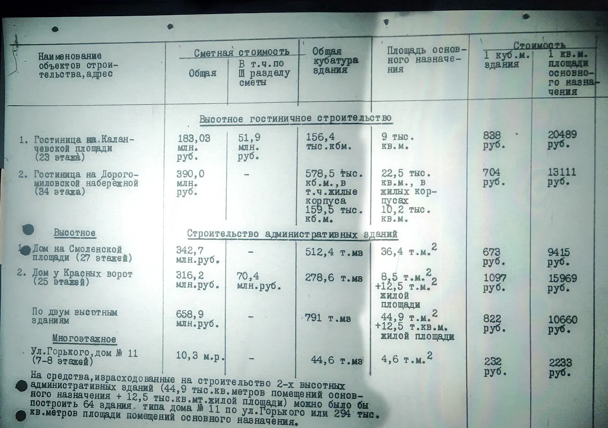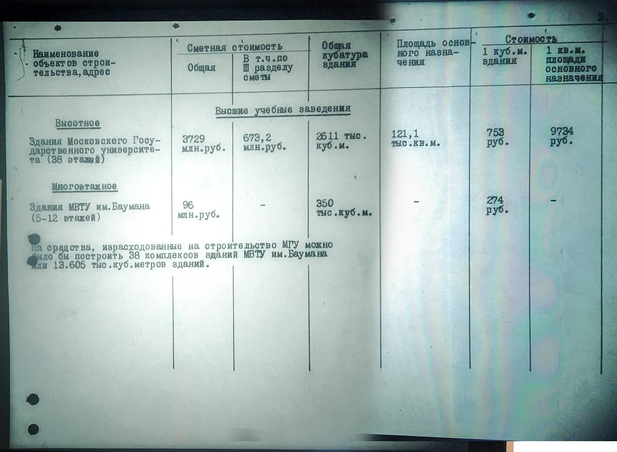 Анализ данных стоимости высотного строительства показывает, что при решении вопроса об этом строительстве проявилось расточительство, вопиющая бесхозяйственность и бесконтрольность. Враг народа Берия руководя этим строительством нанёс огромный ущерб государству.