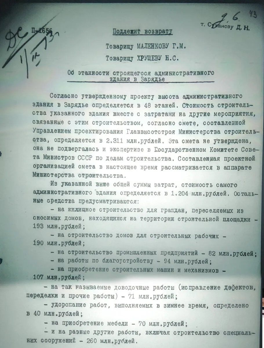Согласно утверждённому проекту высота административного здания в Зарядье определяется в 48 этажей. Стоимость строительства указанного здания вместе с затратами на другие мероприятия, связанные с этим строительством, согласно смете, составленной Управлением проектирования Главвысотстроя Министерства строительства, определяется в 2,311 млн. рублей.