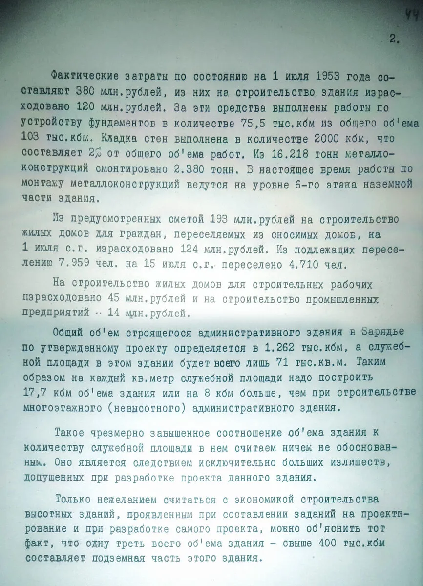 Только нежеланием считаться с экономикой строительства высотных зданий, проявленным при составлении заданий на проектирование и при разработке самого проекта, можно объяснить тот факт, что одну треть всего объёма здания — свыше 400 тыс. м³ составляет подземная часть этого здания.