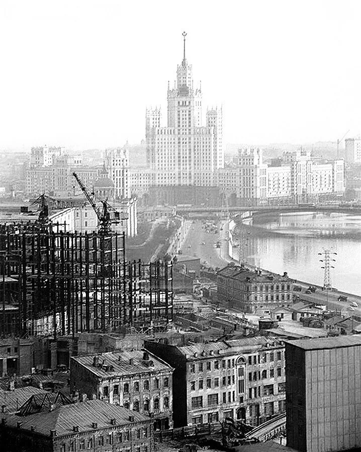 В 1948–1949 гг. в Москве было начато строительство восьми высотных зданий: Московского государственного университета, административных зданий — на Смоленской площади, у Красных Ворот, в Зарядье, гостиниц — на Каланчевской улице и на Дорогомиловской набережной и жилых домов — на Котельнической набережной и на площади Восстания.