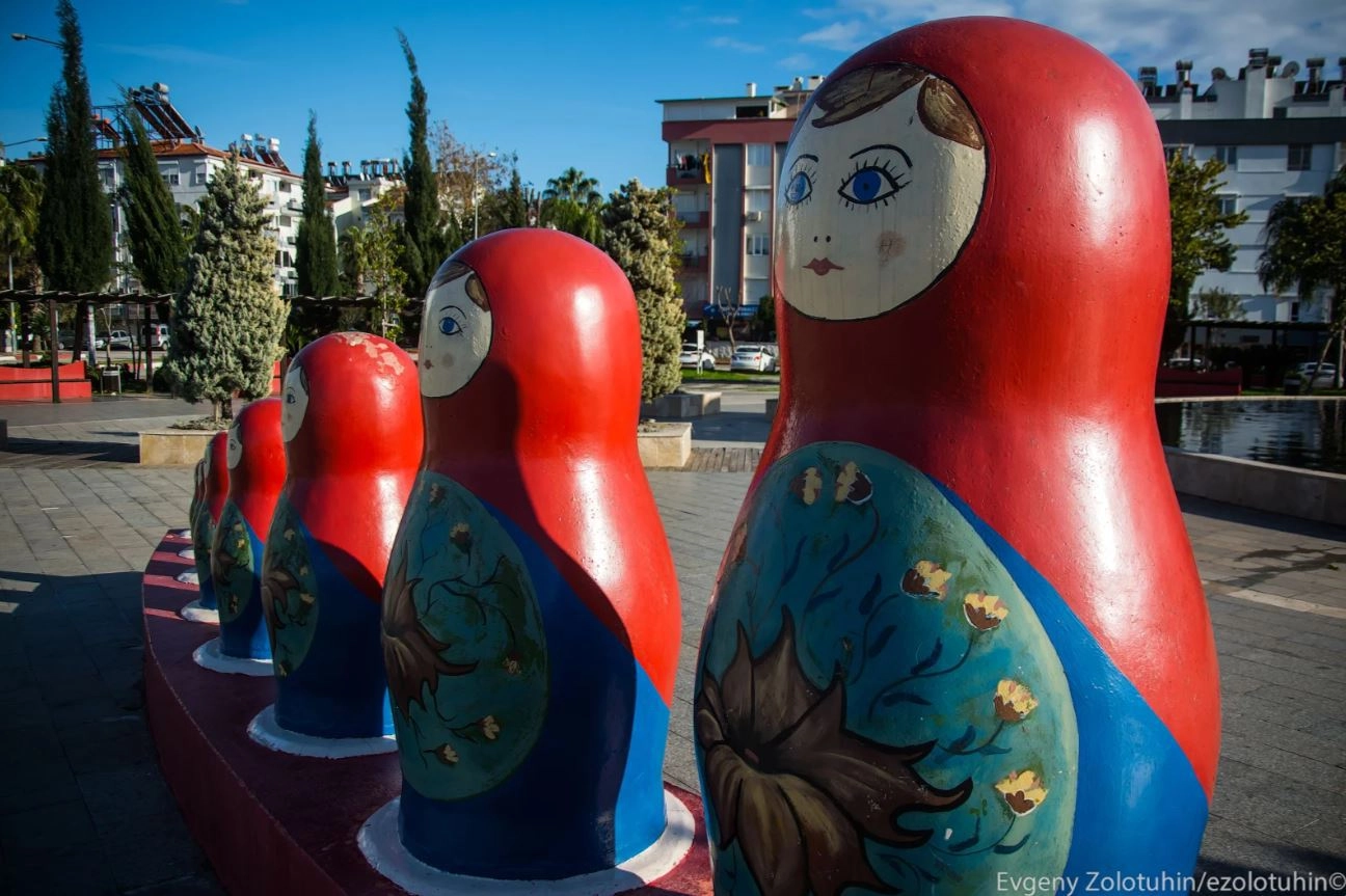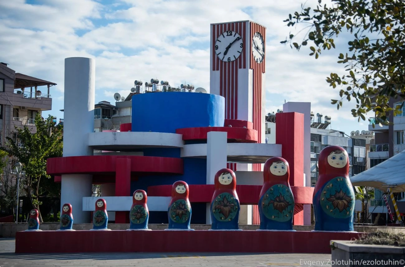 Напротив мечети стоит и сама площадь, главный объект которой фонтан с часами в цветах российского флага и наши, родные для каждого русского, матрешки! Сам парк и площадь имеют даже какое-то официальное турецкое название, но все называют это место просто «Паре Матрешек».
