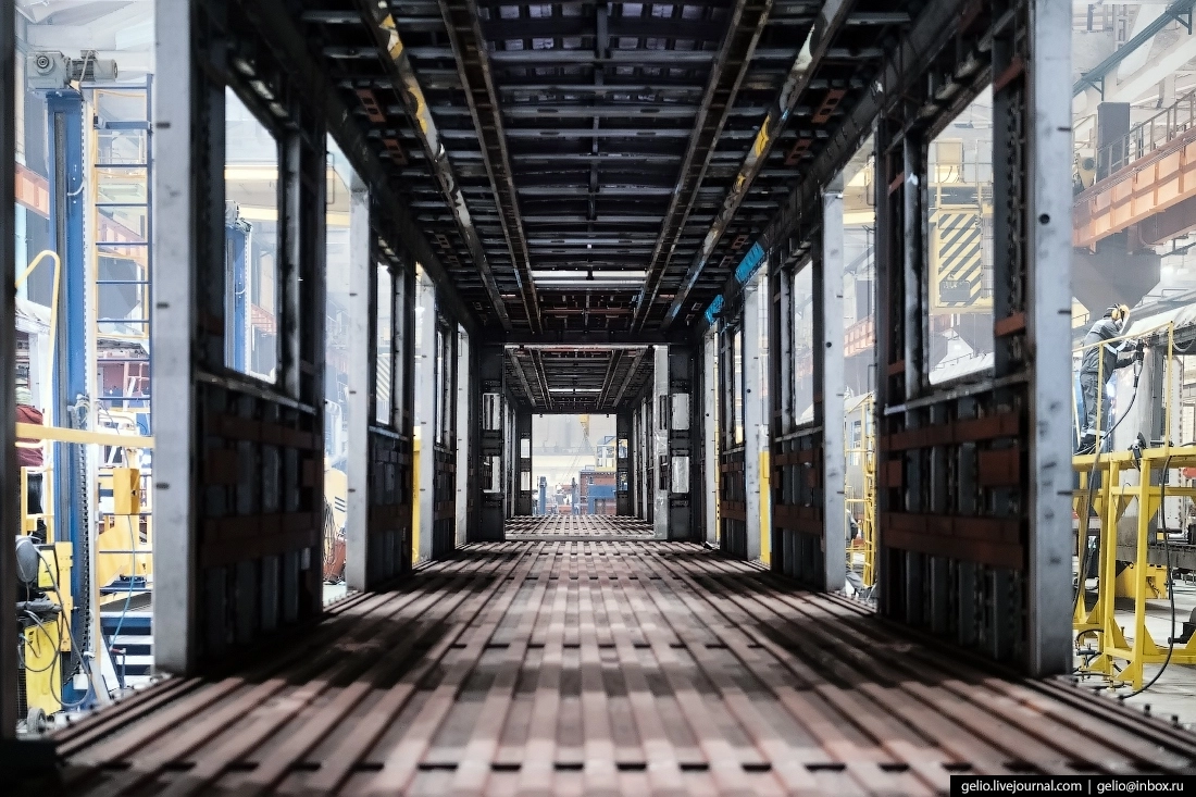 Между цехами вагоны перемещаются с помощью трансбордера.