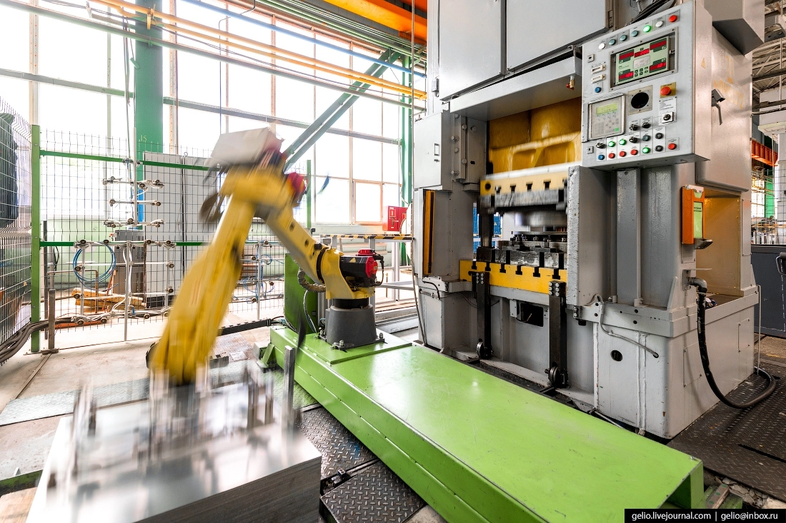 Штамповочный цех. Здесь часть задач выполняют роботы, которые загружают заготовки и снимают с ленты готовые детали.
