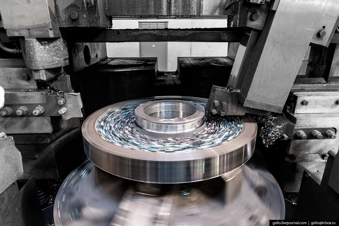 Цех, в котором делают тележки и колесные пары для будущих электровозов. На токарном станке обрабатывают большое зубчатое колесо.