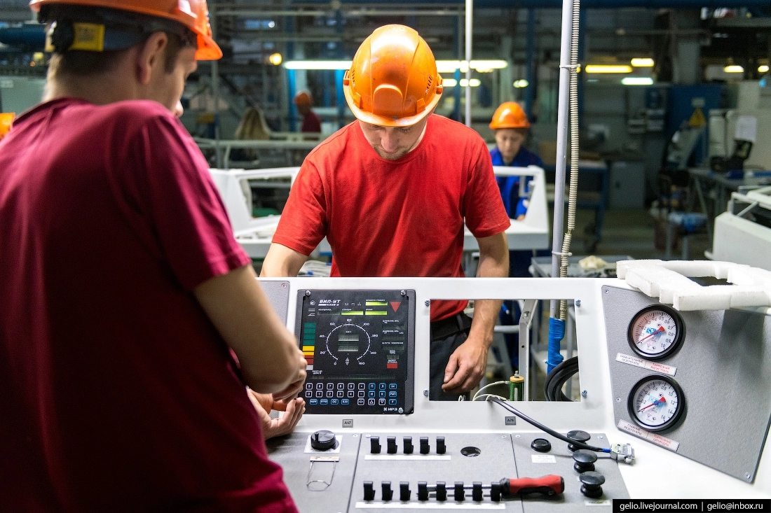 Работники экспериментально-аппаратного цеха монтируют пульт машиниста. Каждая новая модель электрического аппарата попадает в серийное производство только после того, как пройдет стадию опытного образца.