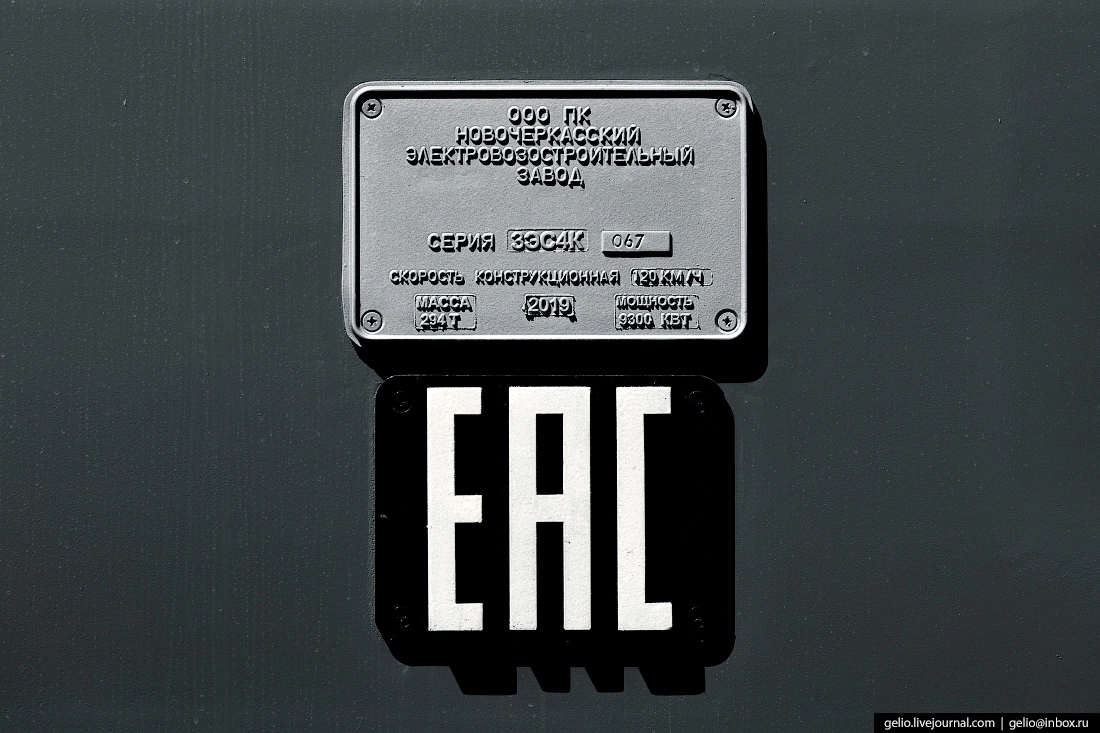Шильдик грузового трехсекционного электровоза 3ЭС4К «Дончак». От двухсекционной модели он отличается наличием промежуточной секции. Она увеличивает его мощность в 1,5 раза и позволяет водить грузовые составы массой до 6000 тонн. Электровозы серии «Дончак» работают на магистралях Октябрьской и Северо-Кавказской железной дороги.