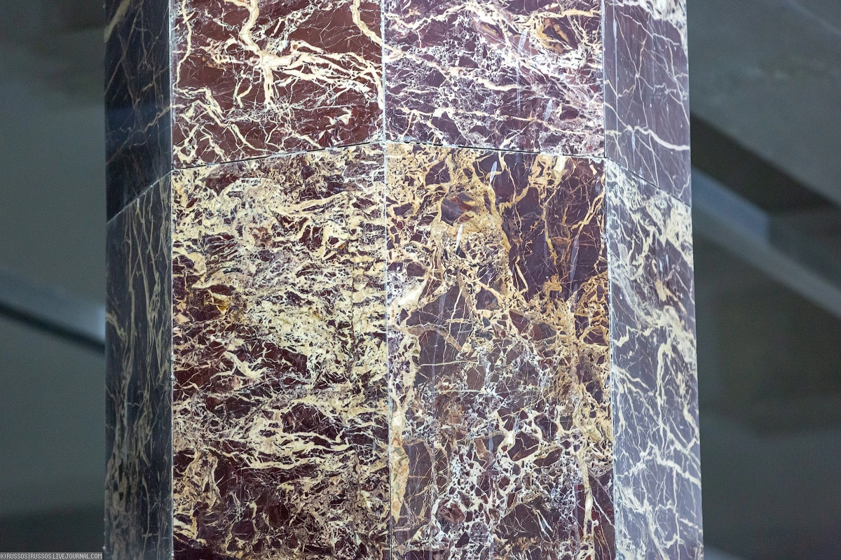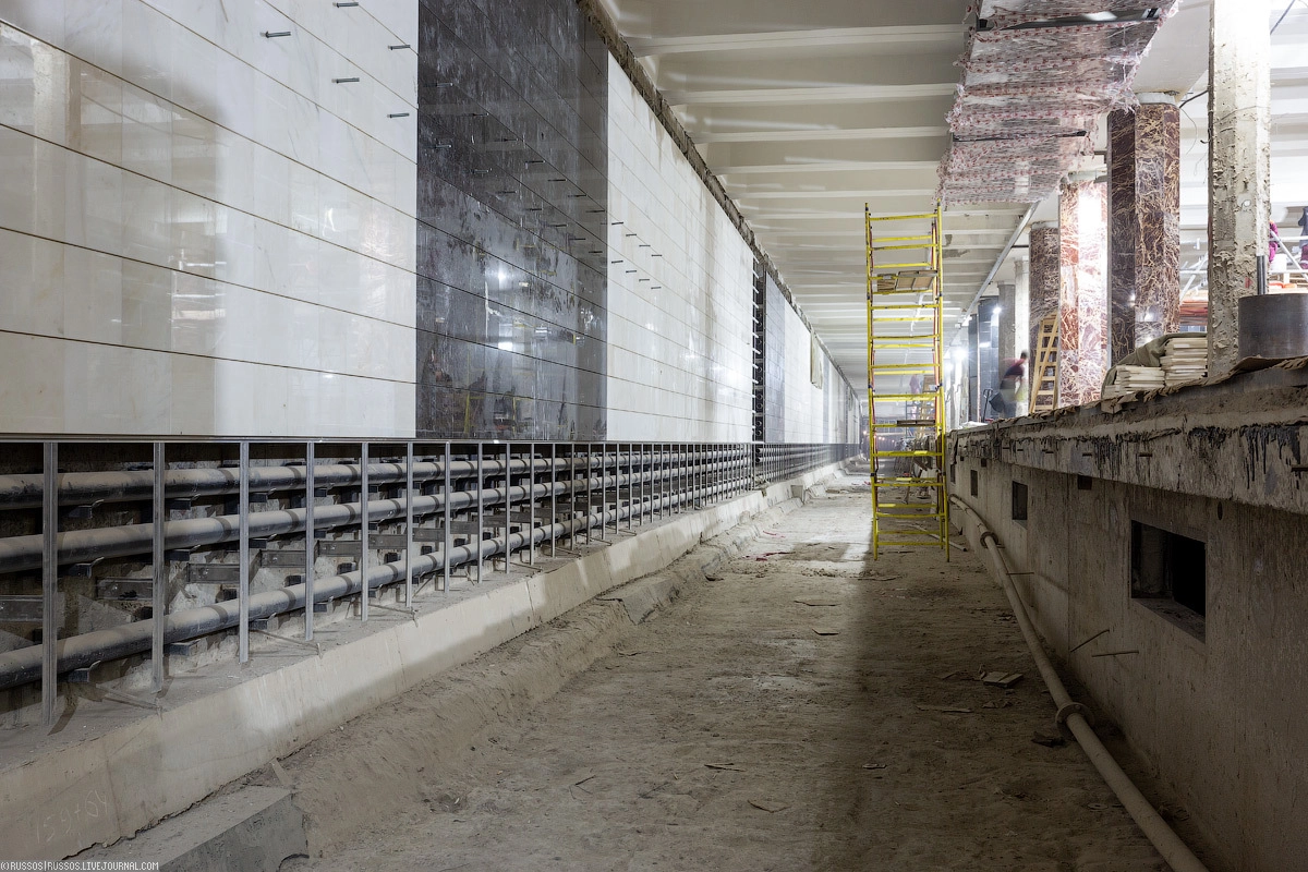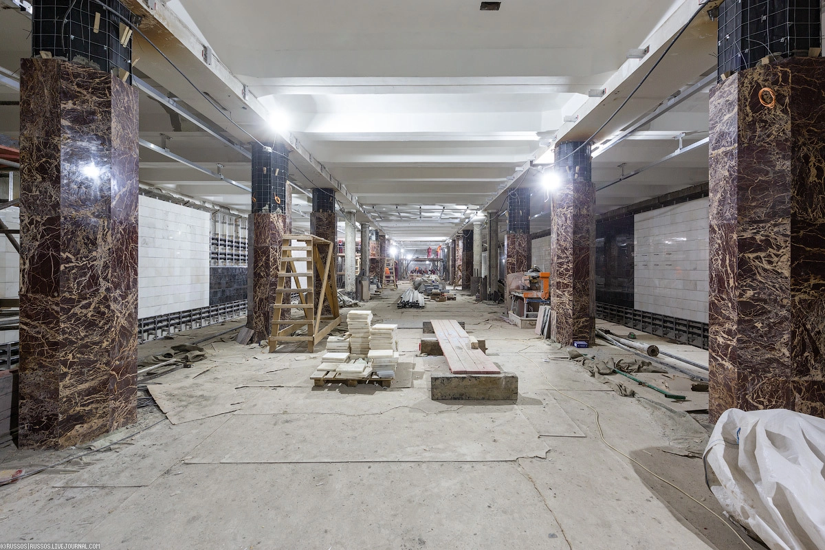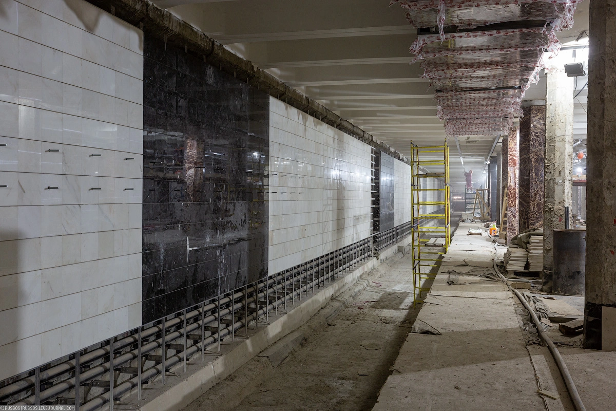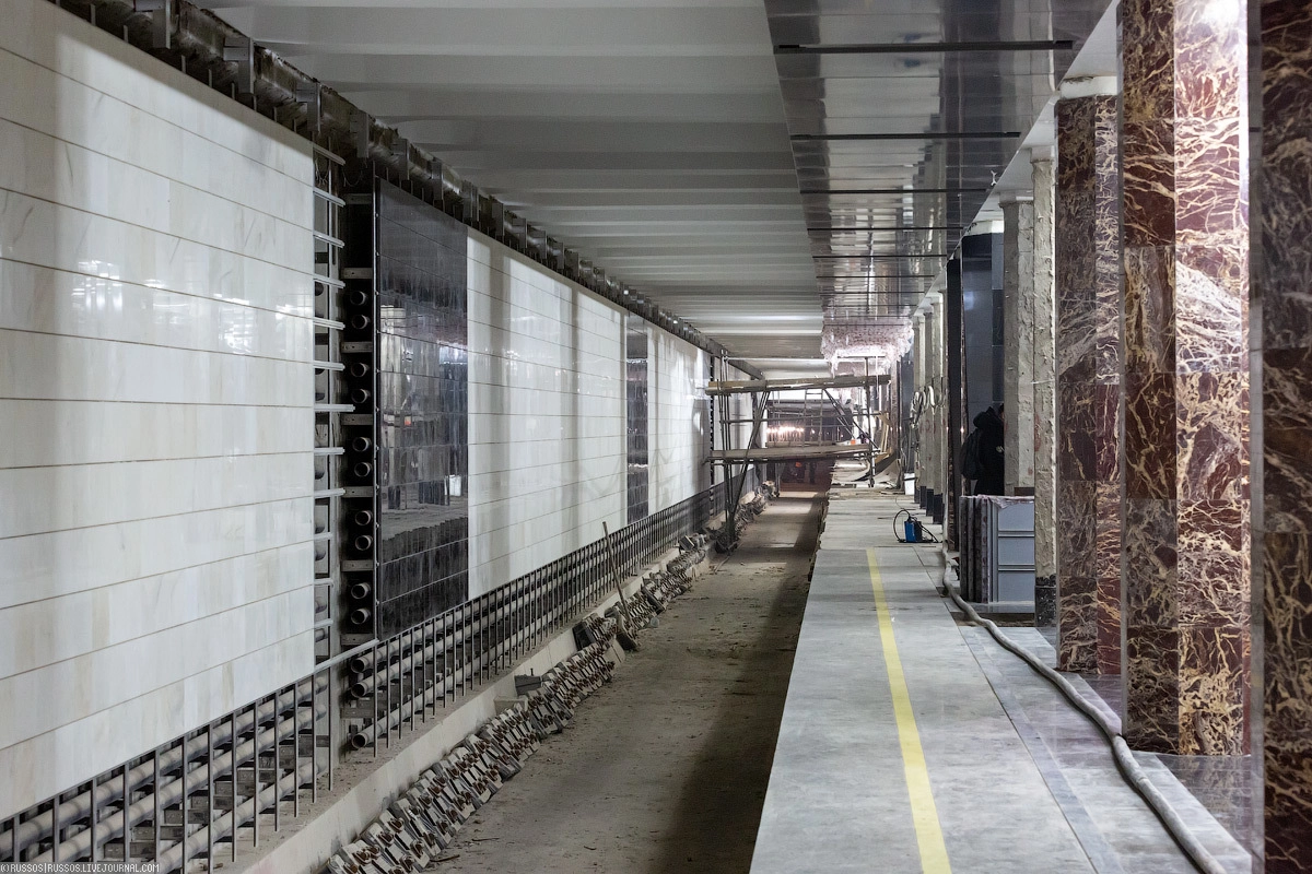 4. Керамическую плитку на путевой стене заменили на белый мрамор. Интересно, снизу останется красная полоска, как было на станции?