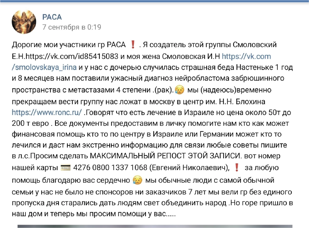 В начале сентября пост с просьбой о материальной помощи появился в одной из групп в соцсетях, посвященных разоблачению лжи современной науки и восстановлению «истинных, славяно-ведических ценностей».