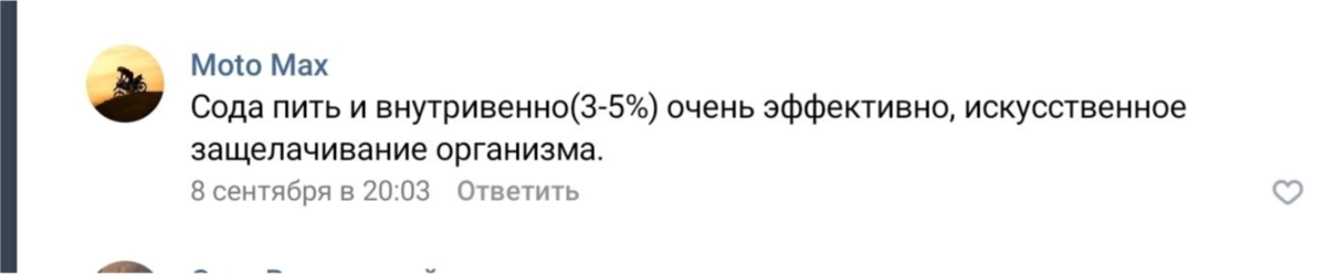— На самом деле все действие соды и перекиси заканчивался на кишках, — прокомментировала этот метод лечения врач-онколог Татьяна Антонова. — Все, что всасывается в кровь, уже претерпело изменения в кишечнике и потом будет взаимодействовать с буферными системами крови. Ведь кишечник — это слои клеток. И транспорт этого всего из просвета кишечника идет ровно так же, как и всех остальных веществ. Лечение содой и перекисью — это развод на лохов-двоечников, плохо учивших биологию в школе.