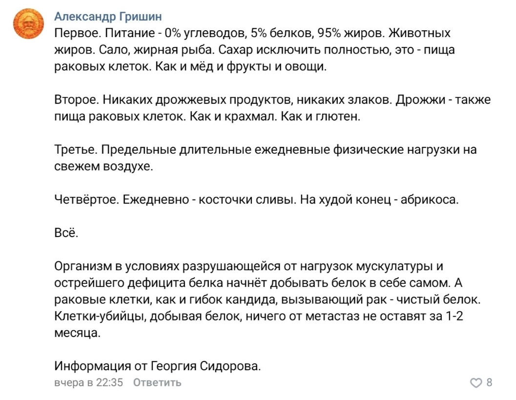 — Ни один уважающий себя врач-онколог не будет это комментировать. Никто не будет всерьез объяснять, почему не надо есть стекло и засовывать гвозди в ухо.