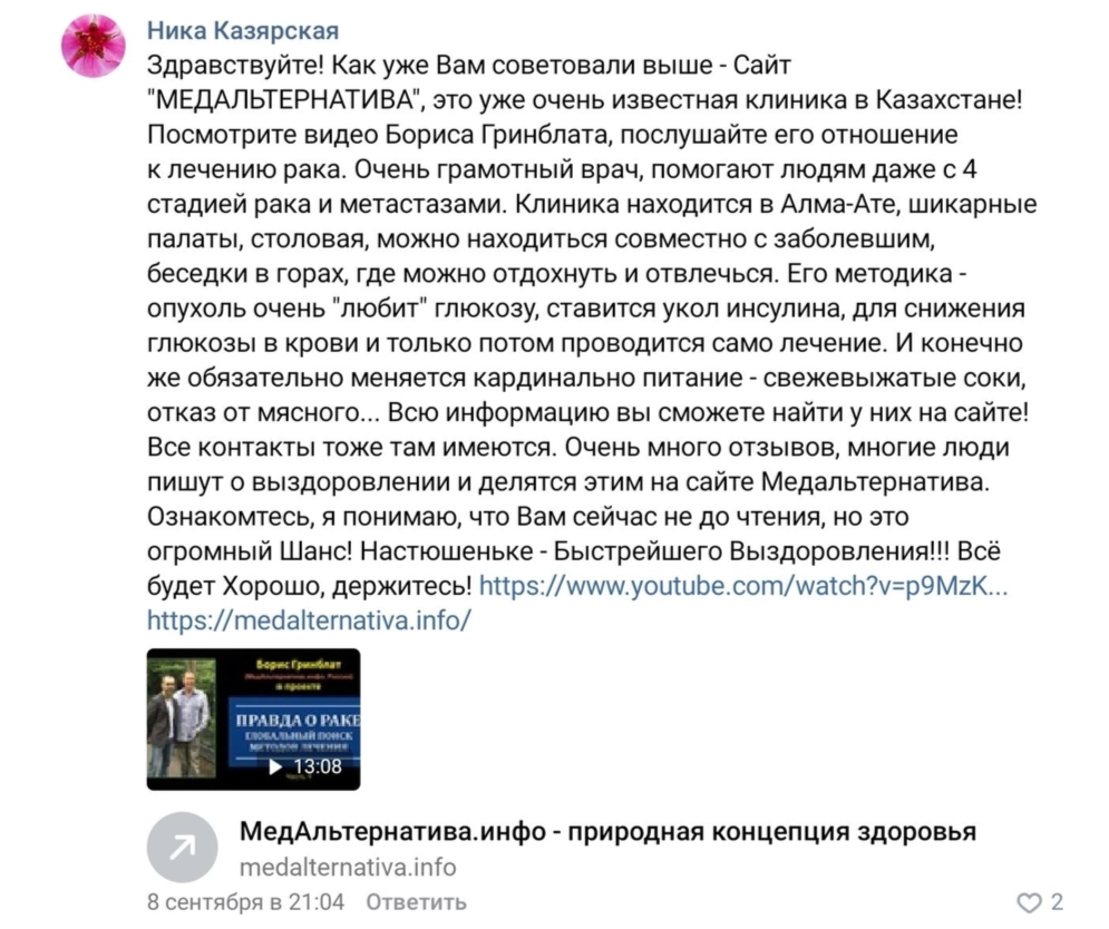 Участники группы активно предлагали отцу обратиться в проект Бориса Гринблата «Медальтернатива» и клинику в Казахстане, с которой он сотрудничает.