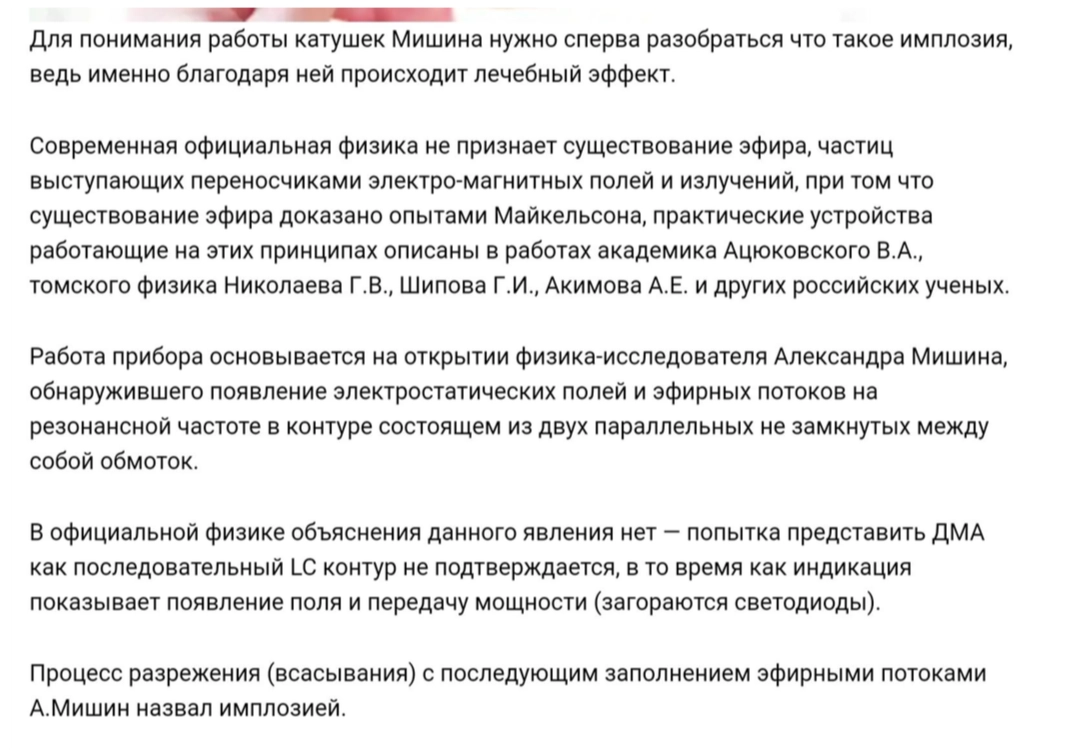 На одном из сайтов, где продают эти волшебные приборы, рекомендуют для понимания принципа действия этого чудо-прибора сперва разобраться, что такое имплозия. Так вот, имплозия — это термин, которым изобретатель волшебных катушек А. Мишин назвал процесс разряжения (всасывания) с последующим заполнением эфирными потоками. Эфир, в свою очередь, — это непризнанные современной физикой частицы, выступающие переносчиками электромагнитных полей и излучений.