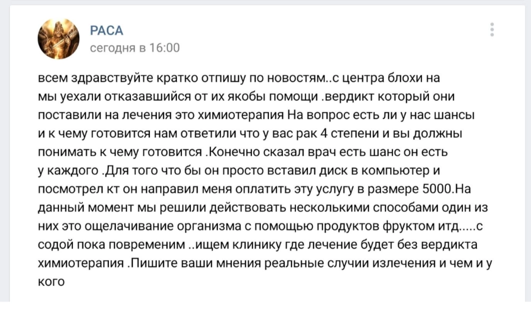 А вот контактов федеральных центров и клиник я не нашла. Впрочем, они бы и не пригодились. Родители ребенка твердо уверены, что химиотерапия — это смертельный яд, который ни в коем случае нельзя давать ребенку. Так что вместо госпитализации в профильное учреждение они продолжают советоваться с подписчиками своей группы и друзьями и искать контакты чудо-профессора, который с вероятностью 90% вылечит их ребенка.