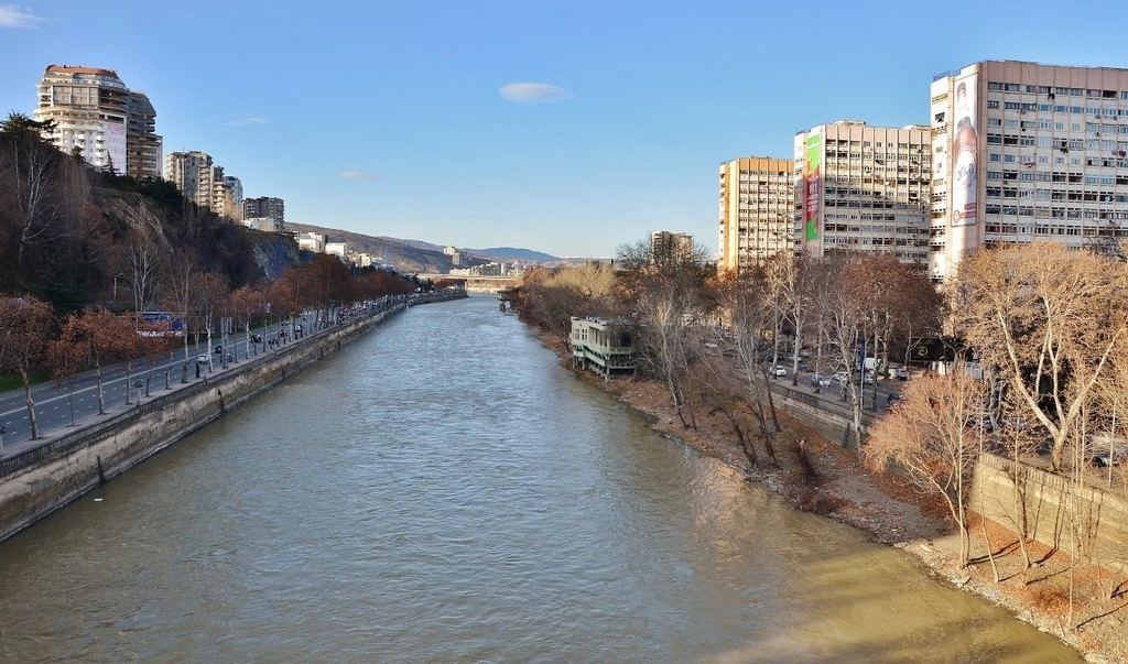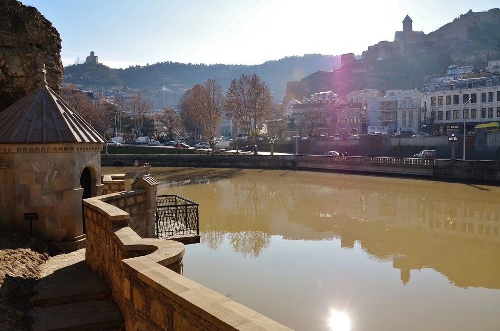 В это время года (зима) речка Кура не впечатляет. Течение слабое, а то и вовсе его нет. Вот весной будет красота, когда начнется таяние снегов в горах и тысячи ручейков устремятся вниз, наполняя реку водой. Она будет бурной и непредсказуемой. Имею в виду регулярно случающиеся паводки, один из которых года три назад практически стер с лица земли тбилисский зоопарк.