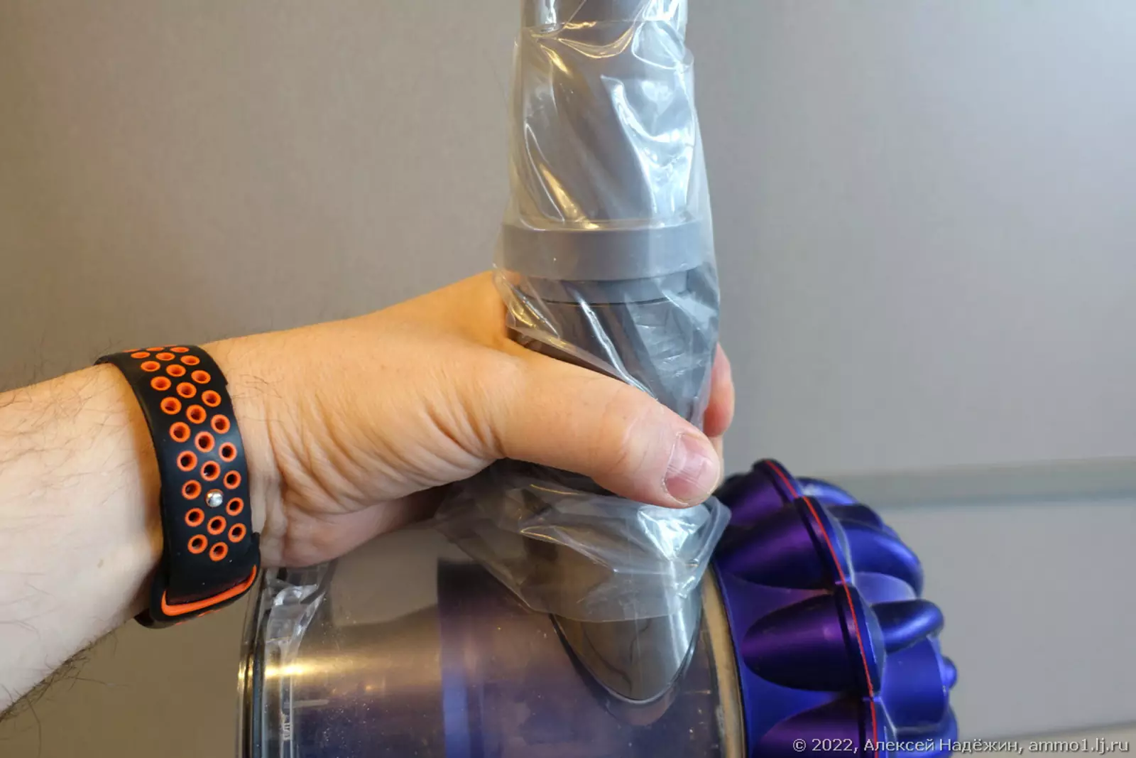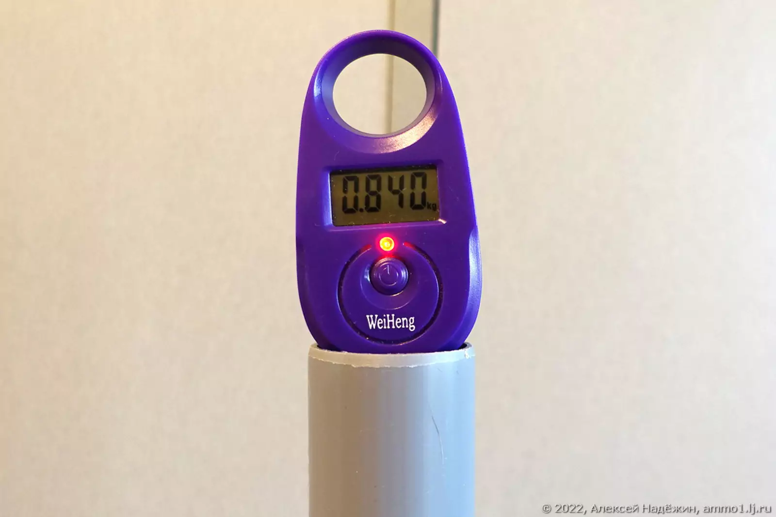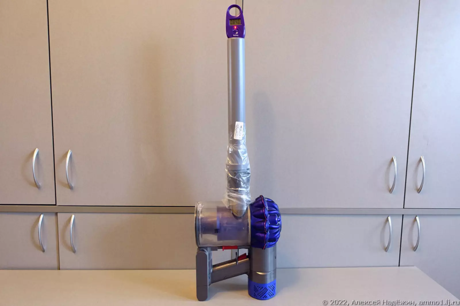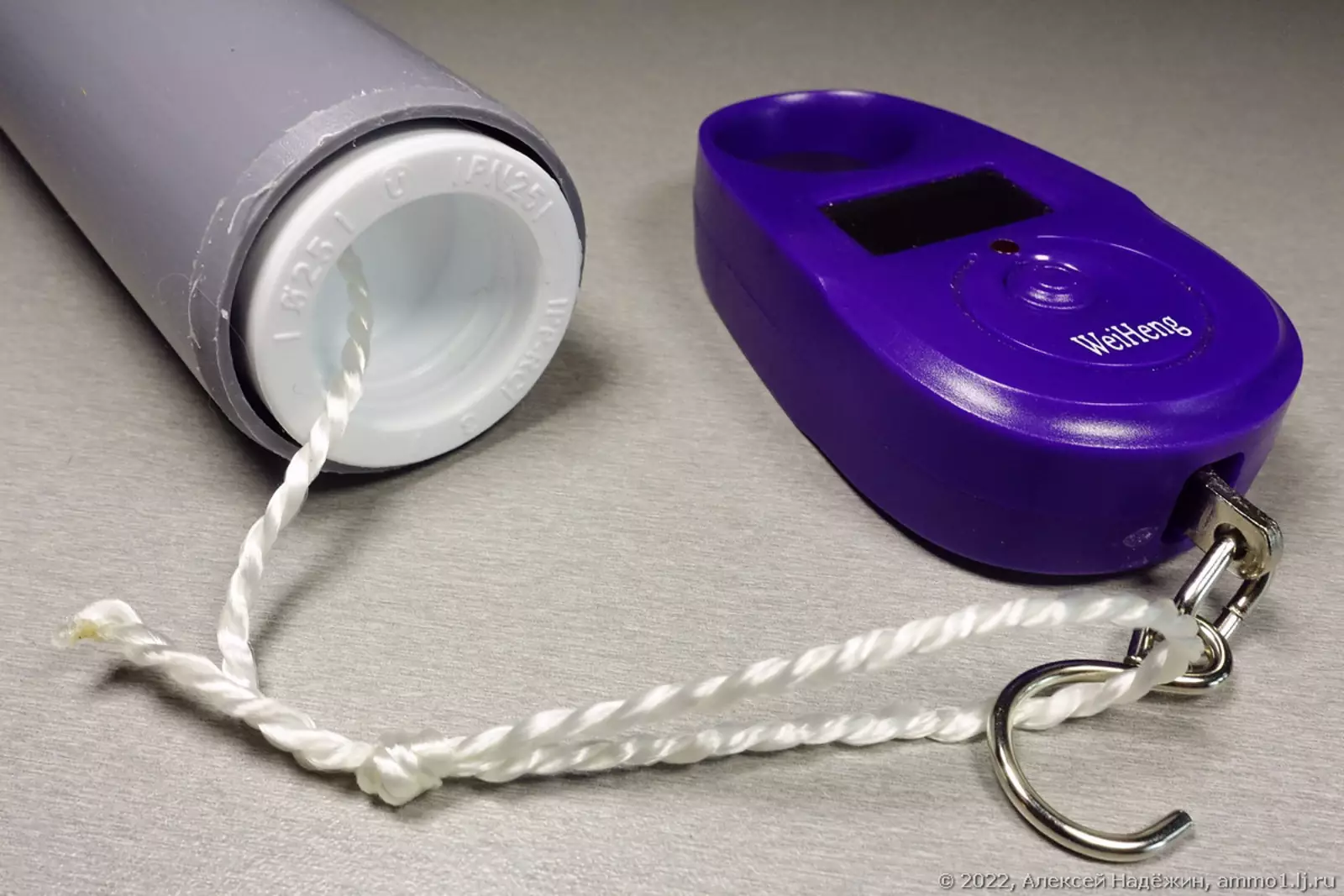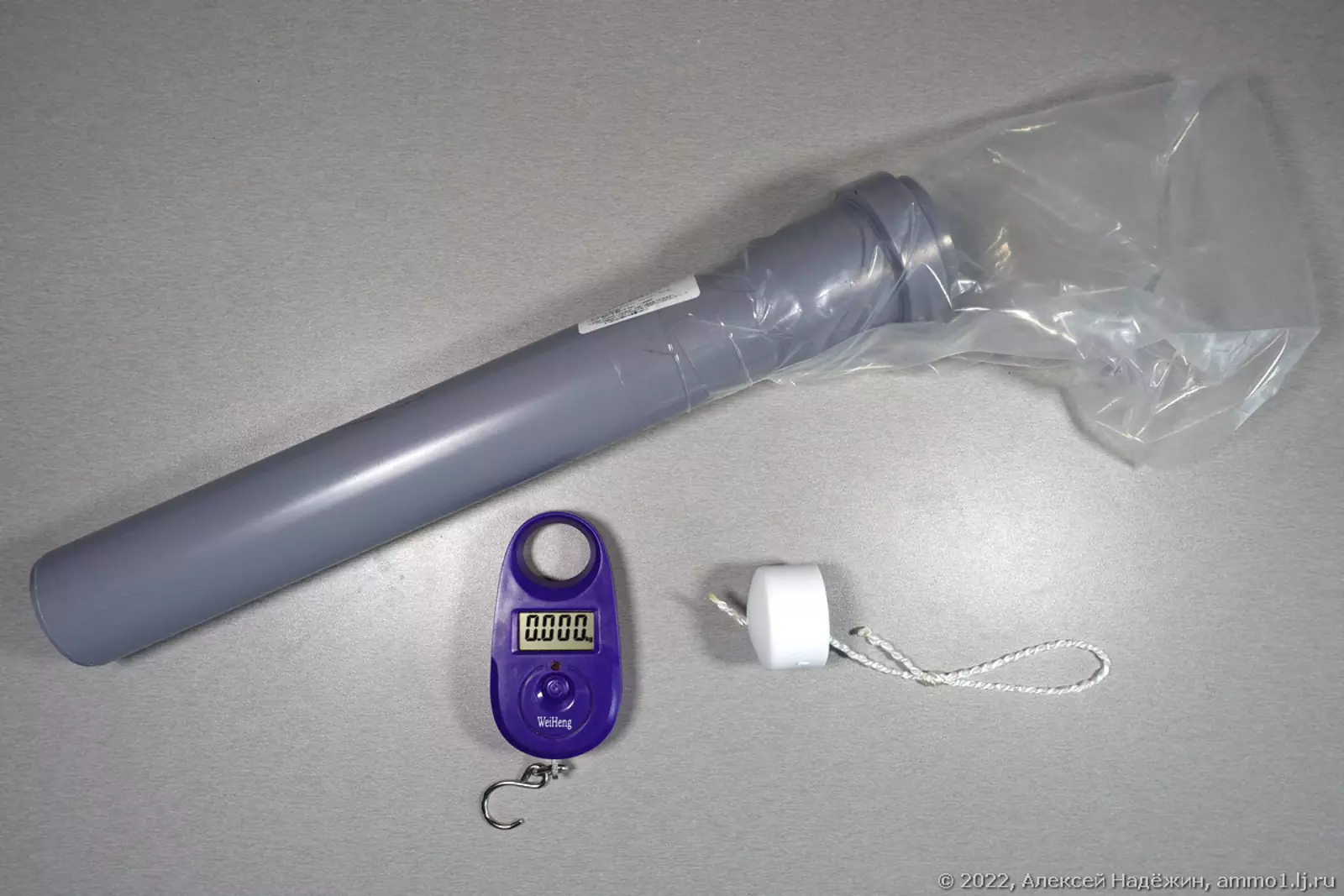 К трубе приклеен скотчем пакет из плотного полиэтилена с отрезанным дном для герметичного подключения к любому пылесосу. В поршне просверлено отверстие и привязана верёвка с петлёй, за которую зацепляется крюк весов.