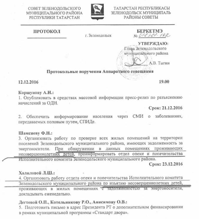 Организовать работу отдела опеки и попечительства Исполнительного комитета Зеленодольского муниципального района по изъятию несовершеннолетних детей, проживающих в жилых помещениях с задолженностью за энергоносители, докладывать еженедельно.