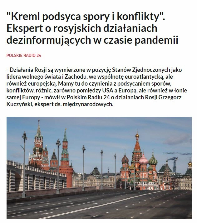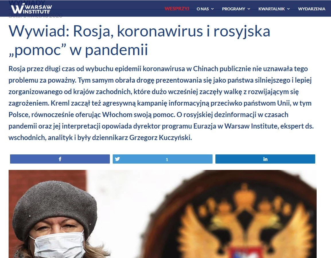 Так, на портале аналитического центра «Варшавский институт» было опубликовано интервью с аналитиком и экспертом по восточной политике Гжегожем Кучиньским, который поведал о «российской дезинформации во времена пандемии».
