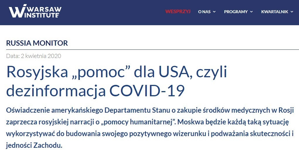 «Варшавский институт» также не преминул раскритиковать и отправку Россией гуманитарного груза в США. На портале организации говорится о том, что заявление Госдепартамента США о закупке медицинских средств в России противоречит российскому нарративу о «гуманитарной помощи».