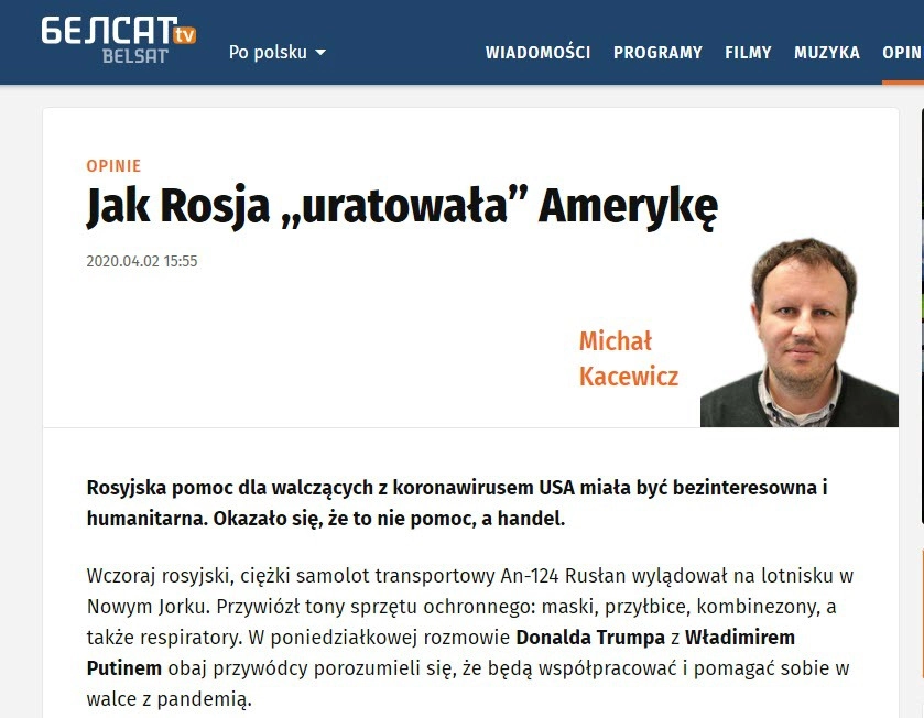 Польские власти, конечно, могли дать достойный ответ «спецоперациям Кремля» в Италии и США, например, отправив подразделения Войска Польского на помощь заболевшим итальянцам или послав гуманитарный груз в США, однако вместо этого проправительственные и прочие медиа привычно поливают грязью действия России.