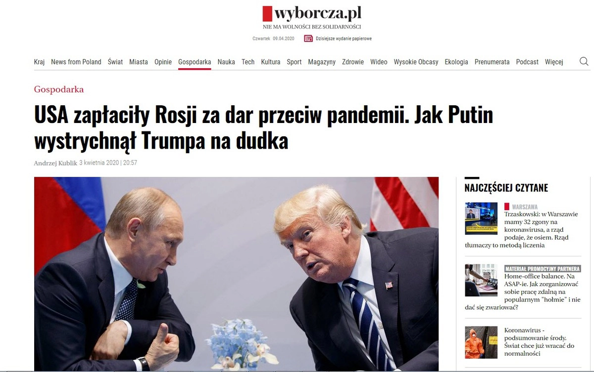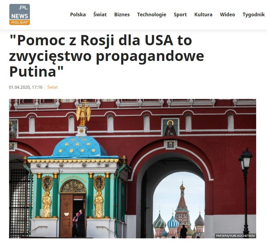 В подобном ключе пишут и различные польские медиа. Либеральная Gazeta Wyborcza озаглавила свой материал «США заплатили России за дар против пандемии. Как Путин оставил Трампа в дураках». А портал телеканала Polsat выпустил статью под заголовком «Помощь из России для США — это пропагандистская победа Путина», в которой приводятся слова Нины Янкович, эксперта из центра Вильсона в Вашингтоне.
