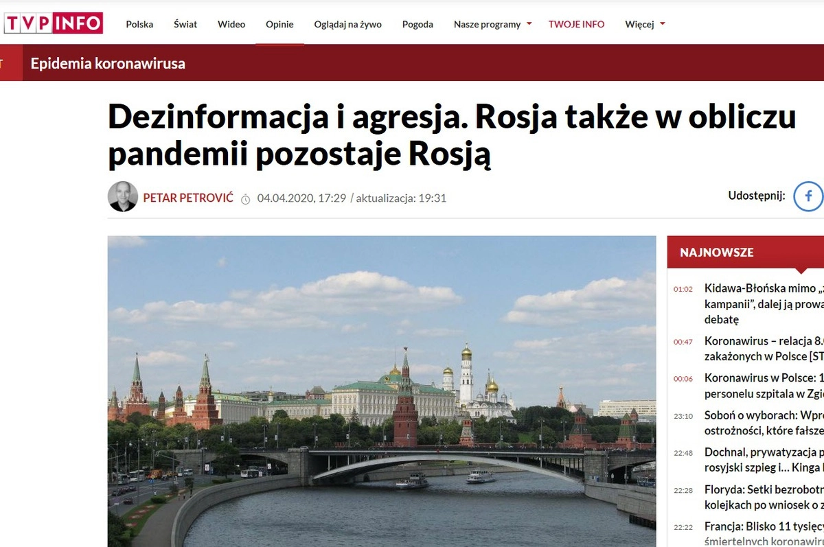 На портале государственного телеканала TVP Info появился материал «Дезинформация и агрессия. Россия же в условиях пандемии остается Россией», в котором сообщается, что «коронавирусная пандемия не повлияла на снижение агрессивных действий Кремля как в дезинформации и манипуляциях, так и в попытках военного запугивания государств региона».