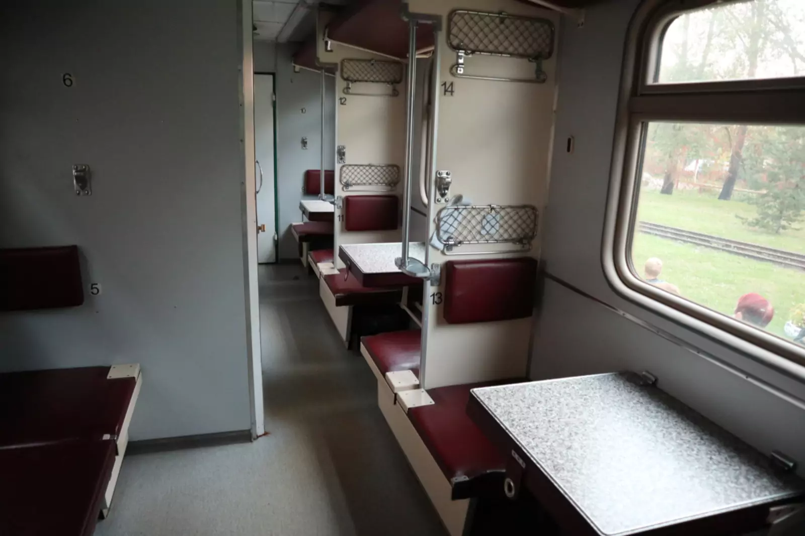 Внутри всё похоже на ширококолейный формат: те же элементы, те же материалы, тот же переворачивающийся столик, такие же полки, подставки для ног и даже сеточки для вещей! Но всё это — узкоколейное! При определённом ракурсе даже не отличишь такой вагон от обычного!
