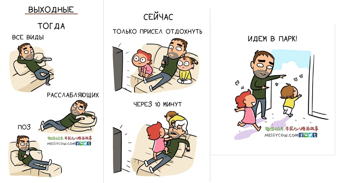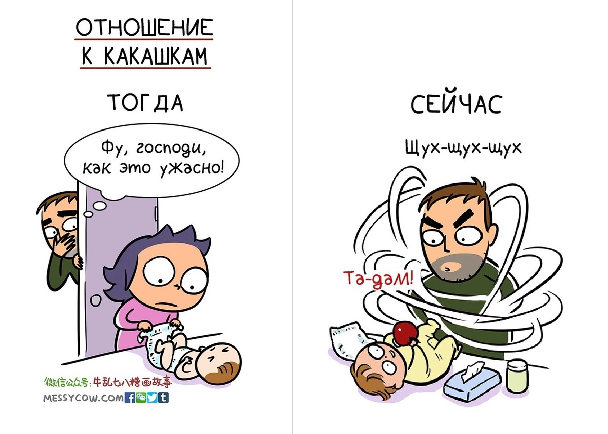 Кто, как не дети, способны перевернуть привычную жизнь с ног на голову! И вот уже бывшие рок-музыканты старательно меняют памперсы, а самые отъявленные гуляки теперь прогуливаются с коляской. Считается, что с появлением ребёнка сильнее меняется жизнь мамы, однако мать двоих детей понаблюдала за своим мужем и решила рассказать, как сильно меняется и жизнь отцов. Вэн Чэнь (Weng Chen), известная под псевдонимом Messy Cow (Неопрятная Корова), нарисовала юмористические комиксы о радостях и сложностях жизни в семье с детьми, и в них нет никакой философии, только реальность и самоирония.